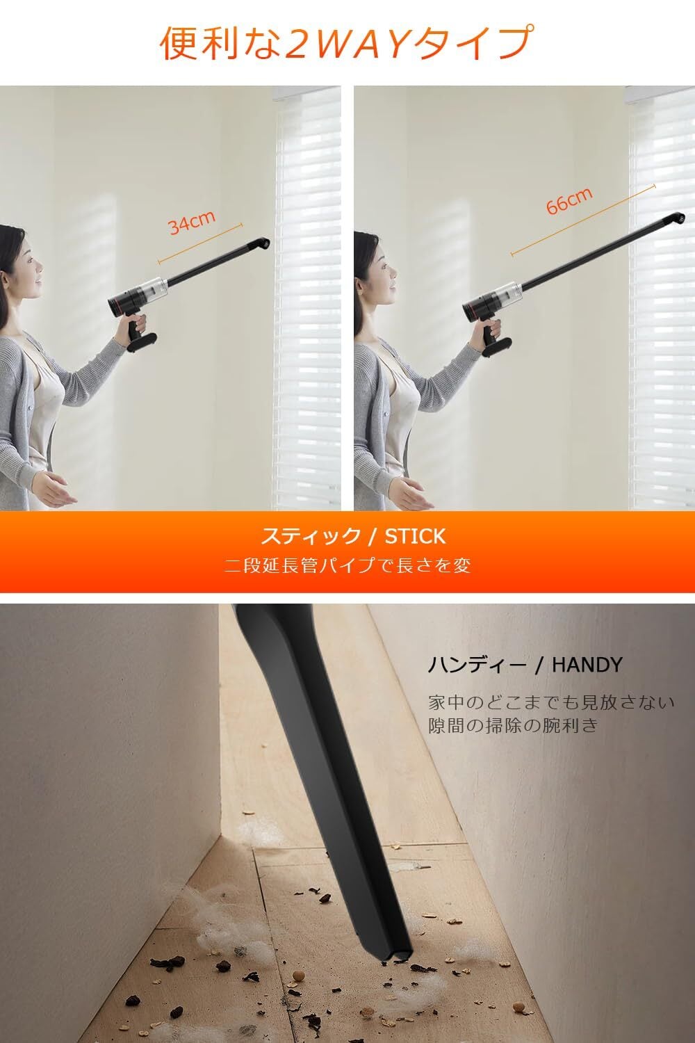 【2way仕様でシーンを選ばない】2wayスティッククリーナーとしてもハンディクリーナーとしても使用可能。付属の5種類ノズルで、床用ノズルはハードフロアやカーペットを効率よく掃除し、プラシ付きノズルは部屋の隅や家具の隙間、車内の細かい場所も簡単に清掃できます。隙間ノズルは狭い場所に最適で、ソファー用ノズルはソファーやベッドの下までしっかりと清掃できます。