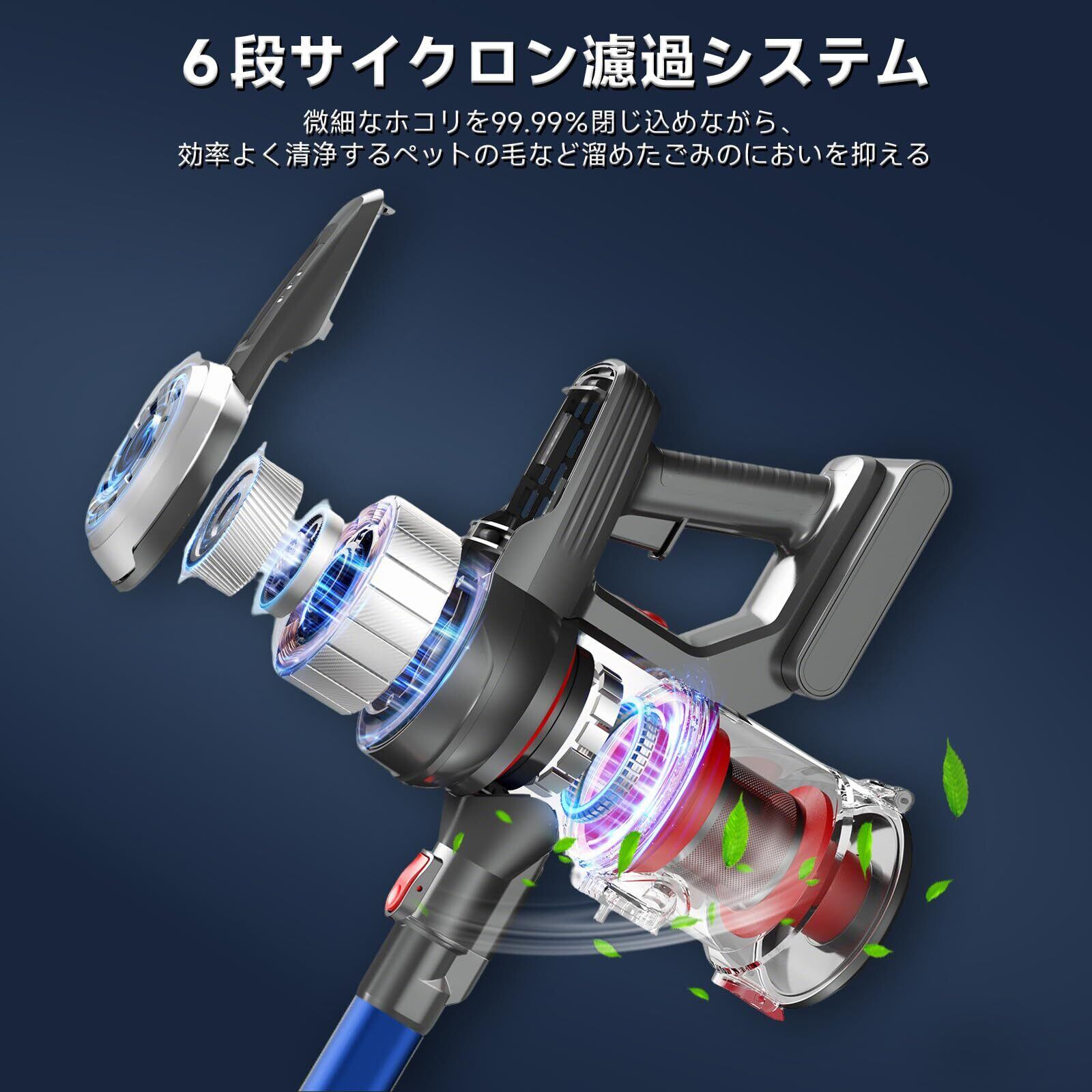 【6重サイクロンクリーナー&1.2L大容量お手入れ簡単!】この掃除機は6層強力濾過サイクロンシステムを採用して、遠心力で「ゴミ」と「空気」を分離して集塵できます。空気だけがフィルターを通るので、目詰まりが少なく、吸引力が持続します。また、このコードレススティック掃除機はサイクロン除塵技術と高性能HEPAフィルターシステムと組み合わて、微細なゴミ·ほこりを取り除き、排気もクリーンに。0.3ミクロンの微細なホコリを99.99%捕らえ、部屋の空気よりもきれいな空気を排出。ペットや小さなお子さまにも安心。人体にも環境にも優しいサイクロン掃除機です。そして、掃除機は大容量の1.2L大容量ダストカップを持っていて、ダストカップにたまったゴミはワンタッチでゴミ捨てられ、手も汚れず衛生的です。さらに汚れが気になる場合は、ダストカップは取り外して分解でき、丸ごと水洗いOK!細かい部分に付着した汚れを洗い流せるので、常に清潔な状態を保てることができます。定期的に洗うことで、吸引力も持続します。【交換用のフィルターの製品番号:B0FH493DP8】