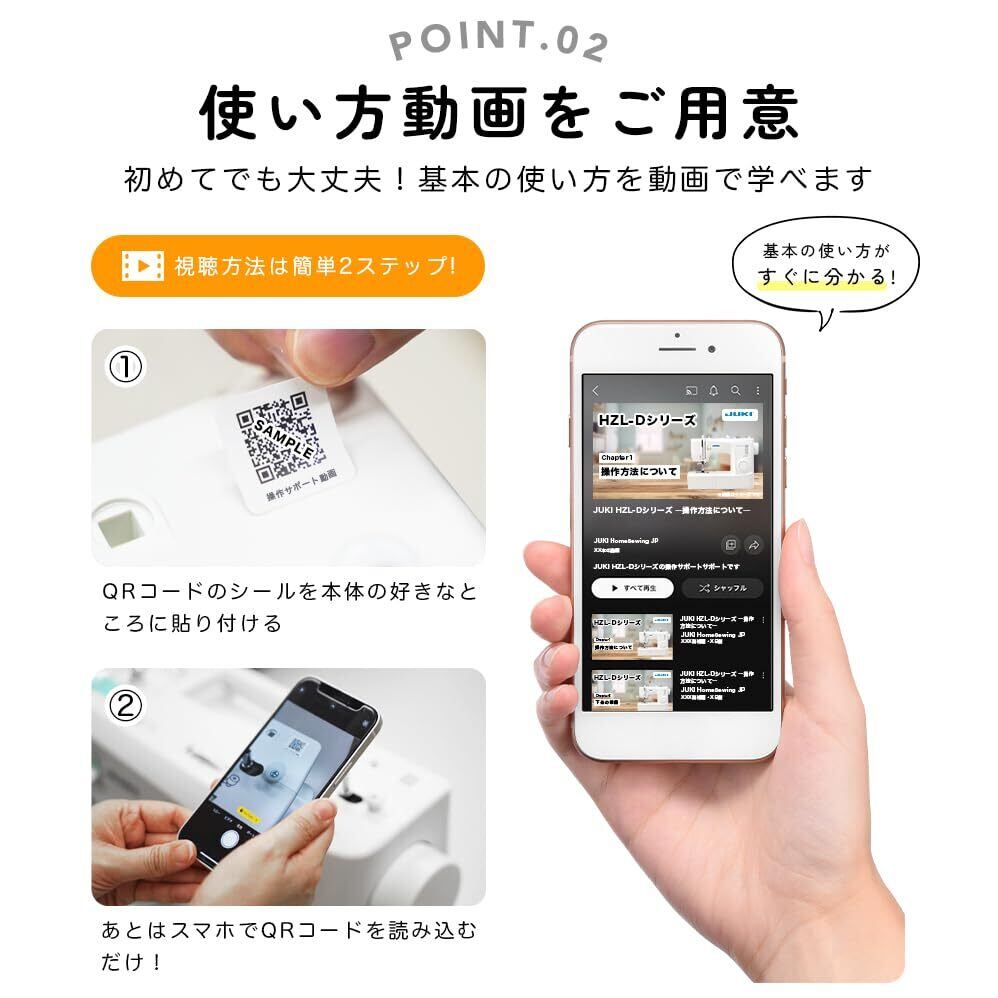付属品:フットコントローラー(電源コード一体式)/ QRシール(操作サポート動画) / ジグザグ押え / 裁ち目かがり押え / ボタンホール押え / ボタン付け押え / 三角ドライバー / リッパー・ブラシ / 針パック(HA×1 #14 3本)/ ボビン4個 / シームガイド / 糸コマ押え(大・小) / 補助糸たて棒 / 糸コマ座 / 取扱説明書 / ソフトカバー
