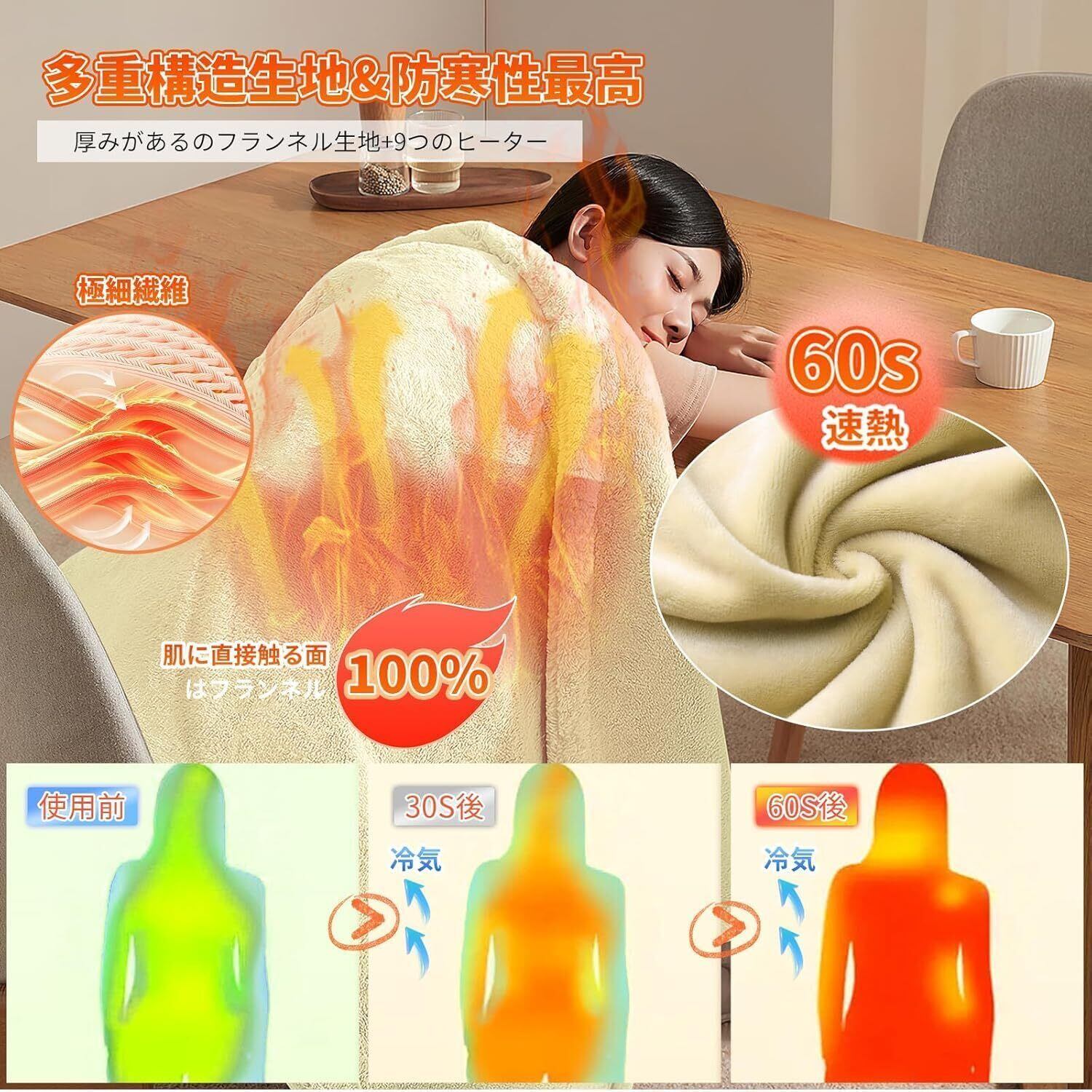 【10秒感熱&高品質発熱素材】電気毛布は高品質な耐久性が高くて、熱伝導性に優れいの炭素繊維ヒーターを発熱体として使用し、電気エネルギーを使用して遠赤外線加熱を生成します。電源を入れてから約10秒で暖かさを感じることができ、約3分で全身が徐々に温まっていきます。短時間で広範囲を均一に加温、より効率的に暖かくなります。多つの遠赤外カーボンファイバーヒーターを内蔵したこの電気毛布は、耐久性だけでなく、熱伝導性に優れており、短時間で均一に加熱することができ、加熱効率を大幅に向上させます。天候の変化にすばやく応答して、あなたに暖かさをもたらします。*毛布の内部には発熱材料が多いため、使用中に水に触れると回路障害を引き起こす可能性があります。