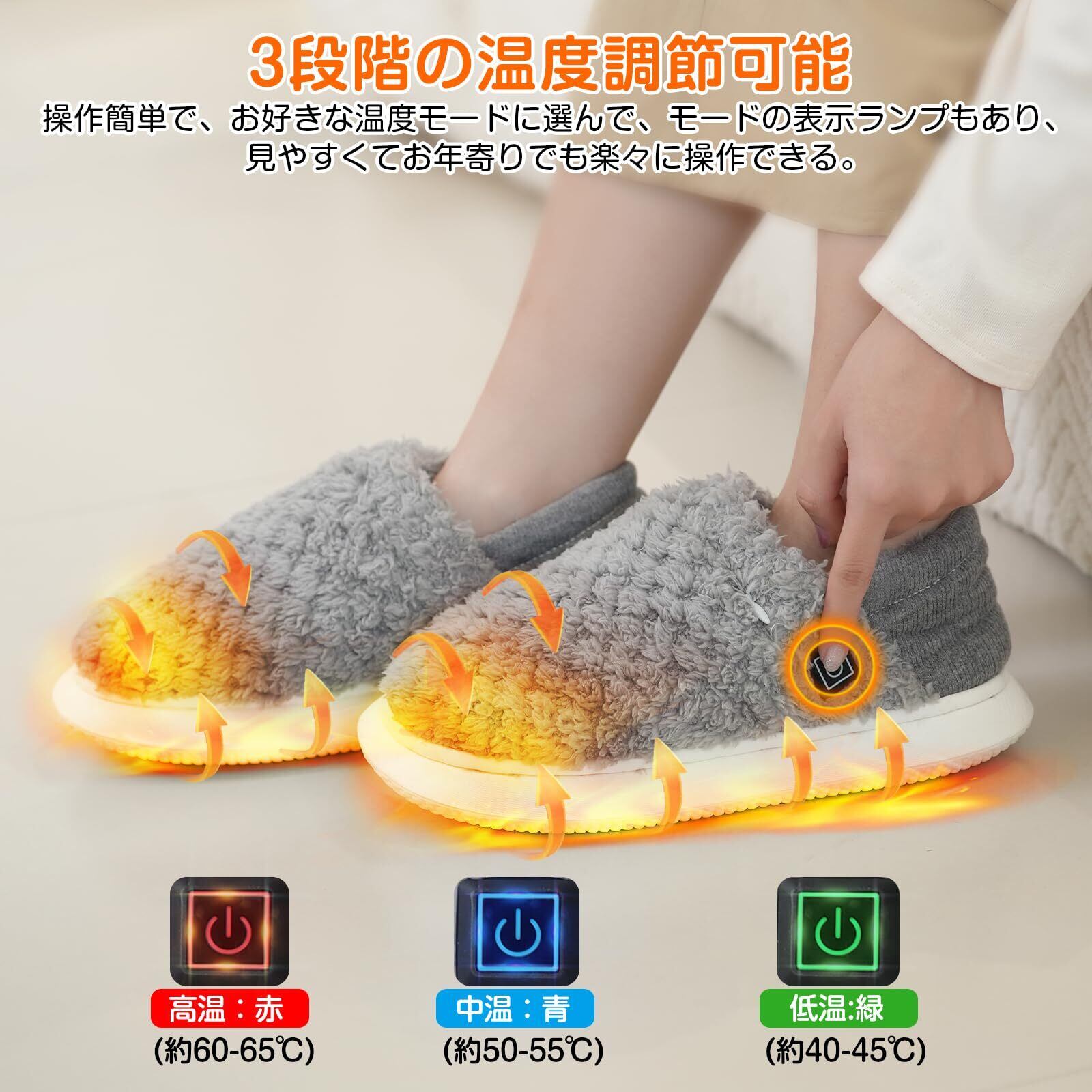 【肌ざわりの良い素材&滑り止め】電熱スリッパ靴底は滑り止め加工されたEVA素材で衝撃を吸収し、床にペチャペチャ貼り付く音がしない、とても静音で歩きやすいです。フットウォーマー全体はふわふわ起毛生地が採用されており、保温性に優れ、そのままでも温かさを感じられます。履き口はゴムで伸縮性があり、しっかりと足にフィットしてくれて安定感抜群の履き心地!