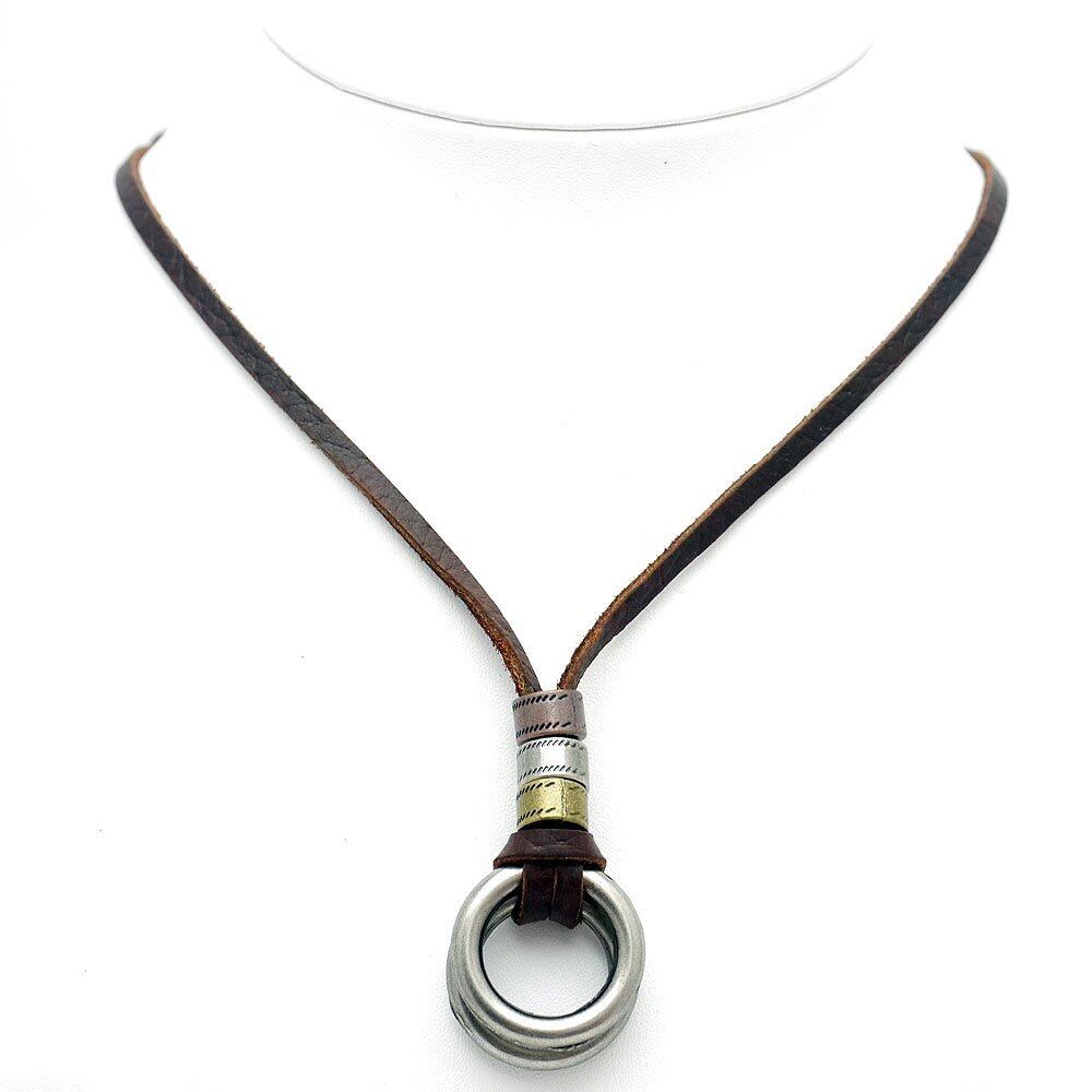 [シルバーワン] ko 2リング 平革レザー チョーカー ネックレス メンズ フリーサイズ ブラウン