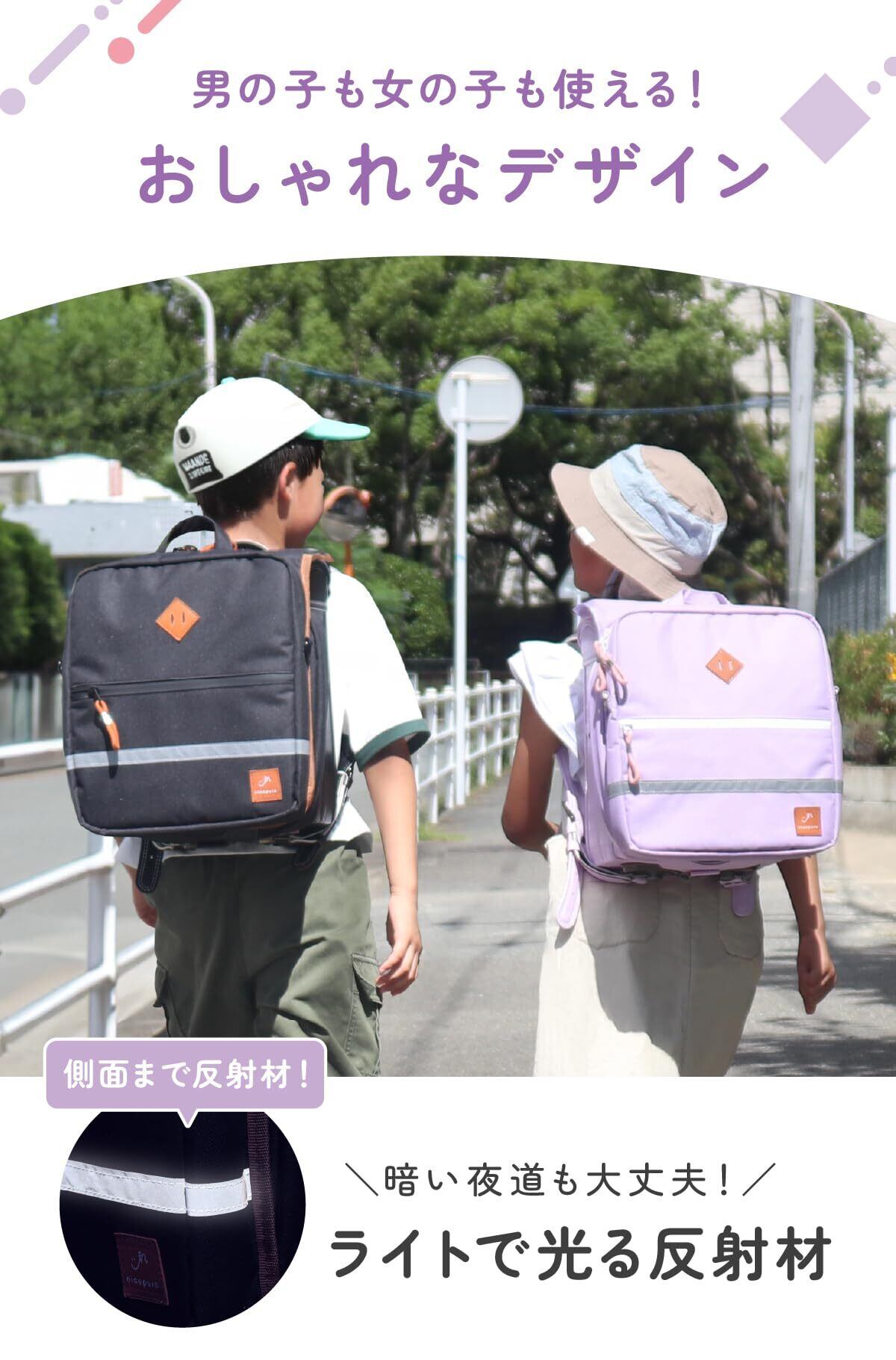 夜道でも安心な反射テープが付いています。通学時の安全面も考慮した設計で、お子様が安心して通学できる環境を提供します。おしゃれなデザインと安全性を兼ね備えた良い商品です。