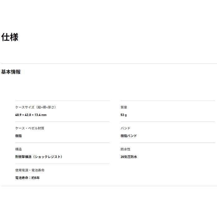 ケースサイズ(縦×横×厚さ)48.9 × 42.8 × 13.4 mm質量 53 gケース・ベゼル材質 樹脂樹脂バンド耐衝撃構造(ショックレジスト)20気圧防水電池寿命:約5年無機ガラスバンド装着可能サイズ 145~205mmストップウオッチ(1/100秒(0’00’’00~59’59’’99)、1秒(1:00’00’’~23:59’59’’)、24時間計)、スプリット付き)タイマー(セット単位:1秒、最大セット:24時間、1秒単位で計測、オートリピート)マルチアラーム・時報報音フラッシュ機能(アラーム/時報/タイマー連動発光)LEDバックライト(スーパーイルミネーター、残照機能付き)ライトカラー LED:ホワイトフルオートカレンダー精度 平均月差:15秒12/24時間制表示切替