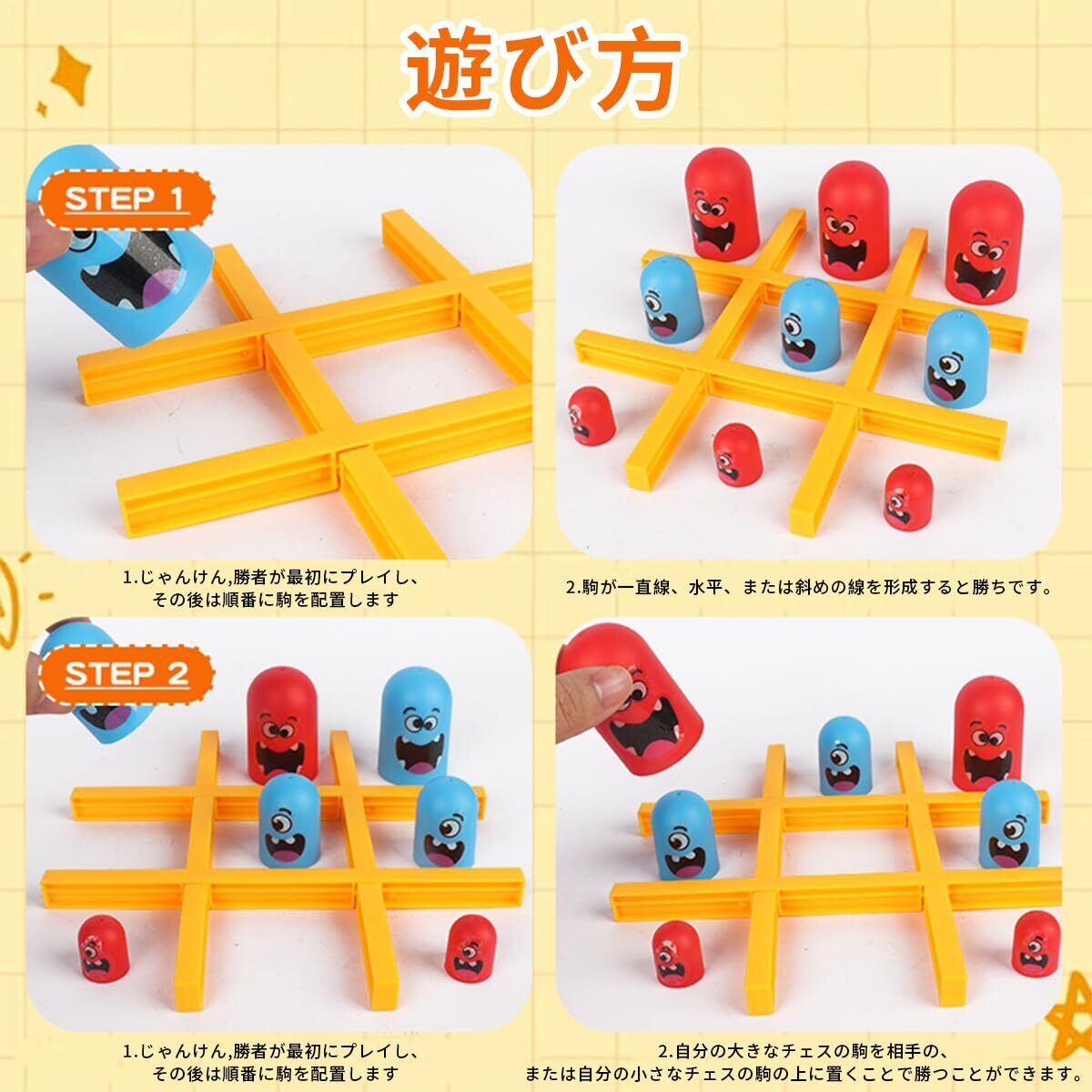 【ゲームのルール】:三目並べのように、同じおもちゃを3つ並べれば勝ちです。相手の駒を自分の駒として取ることもできるため、戦略的な思考が求められます。