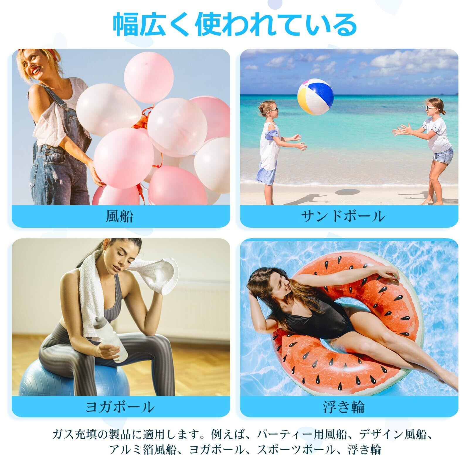 適用範囲:ノズルが斜めて、差し込みやすく、汎用のゴム風船やアルミ風船、エアー枕、浮き輪、エアーマット、子供用ガス入り玩具等に適用します。