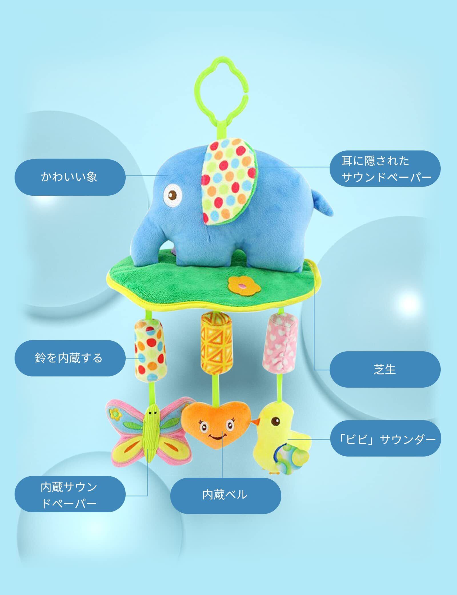 【赤ちゃんの視覚力を育てる】鮮やかな色と可愛い動物の造形は、赤ちゃんの視覚を刺激し、赤ちゃんの色彩感覚を育むことができます。 【聴覚とグリップ力を高める】柔らかいぬいぐるみが風に揺れると、風鈴の音が子供のグリップの意欲をかき立てます。彼らは周囲のものに好奇心を持っています。音がどこから来るかを知りたいです。タッチや聴覚の後、子供たちは日常生活でもっと違った音に注意を払うかもしれません。動物のイメージの耳にはさらさらとした紙があります。赤ちゃんが耳をつまんでいると、はっきりと音が出ます。子供たちはこの面白いデザインに笑わせられます。 【安全出歯おもちゃ】安全無毒素材のベビー玩具。赤ちゃんには無害です。安全な歯ざわりのおもちゃは子供たちに遊びと咀嚼をさせて、同時に赤ちゃんの歯ぐきを緩めることができます。 【フックデザイン】赤ちゃんがおもちゃをぶら下げると、ぬいぐるみ動物風鈴が安全でぶら下がりやすいです。ベビーカーでもベビーベッドでも、持ち運びが便利で、持ち運びや取り外しが容易です。 【新生児プレゼント】ベビーカーのおもちゃは赤ちゃんシャワー、誕生日、子供の日、クリスマスと新年の特別プレゼントです。ゲームパッド、ジム、床セットに使用します。赤ちゃんは0-12ヶ月に適用されます。