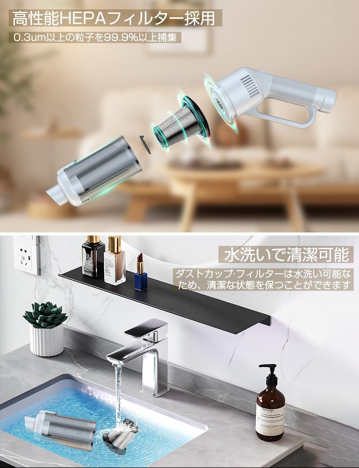 様々な場面に応じた5種類のノズルが付属しており、フローリングからカーペット、さらには家具の隙間まで、あらゆる場所のお掃除が楽々です。特に、HEPAフィルターを搭載しているため、小さなホコリや花粉もしっかりキャッチ。アレルギー対策にもおすすめです。