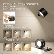 【タッチコント・コードレス】タッチセンサーを採用し、簡単にタッチするだけで、電源オン/オフ、色温度、明るさをコントロールできます。コードレスタイプを採用し、大容量充電式バッテリーに内蔵されて、USBで充電すれば電源が無くても使用可能です。災害時には、懐中電灯の代わりに、停電や防災に緊急対応用具としても使えます。ギフトとしても最適です。最低輝度は完全に充電された状態で最大18時間使用できます。最高輝度で完全に充電される場合に5時間使用できます。35000時間以上超長寿命お持ち、節電・省エネ効果があるLEDブラケットライトです。