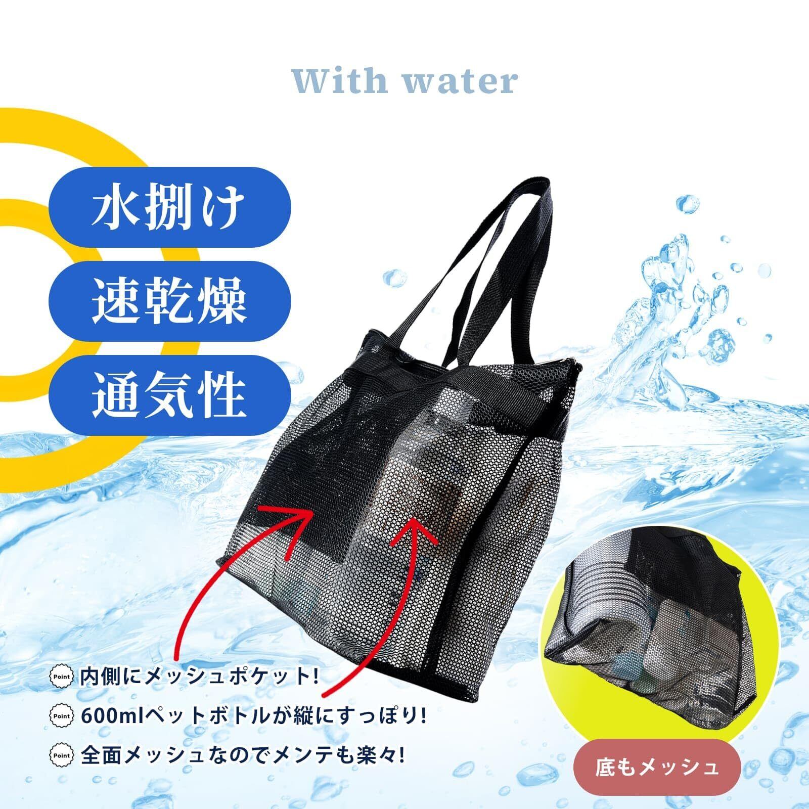 [3glad] メッシュトートバッグ 銭湯・温泉・プール 業務用 速乾・カビ防止 大容量 内ポケット付き ファスナー開閉 男女兼用 スパバッグ 黒