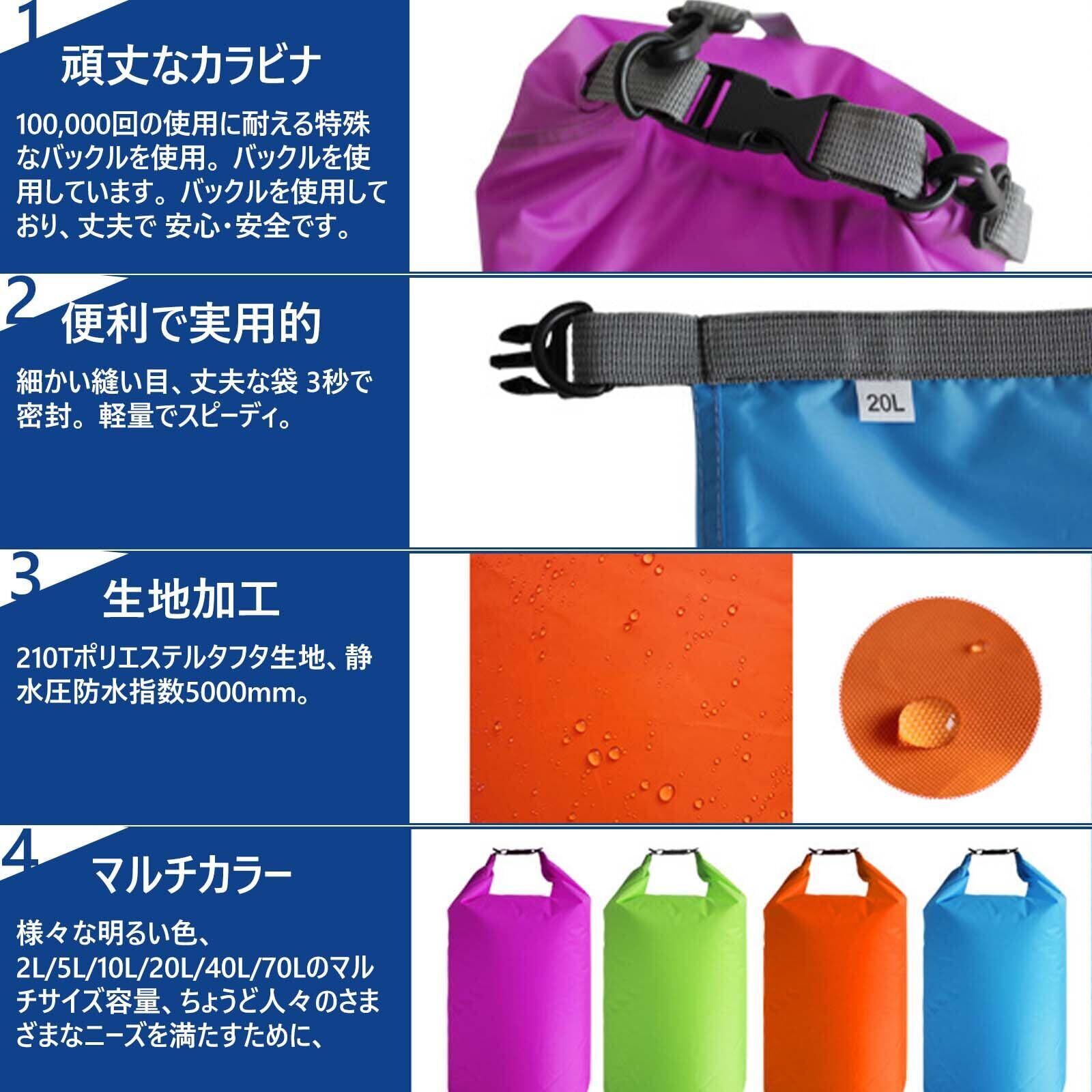 [高品質の防水バッグ] この柔軟な防水バッグとドライバッグは一年中使えるタフなバッグです。210Tポリエステルタフタ生地防水バッグ、PU5000mm、あなたのアイテムを継続的にきれいに保つことができます。 耐久性と防水性のために二重糸で再成型されたシールされた縫い目は、縫い目からの水の浸透を完全に排除します。この製品は、頑丈な防水バッグが必要な方に最適です。 雨、雪、ほこり、砂からあなたの持ち物を守り、ドライに保ちます。 鮮やかなマルチカラー、2L/5L/20L/40L/10L/20L/20L/40L 10L/20L/40L/70Lマルチサイズ容量、ちょうど人々のさまざまなニーズを満たすために。