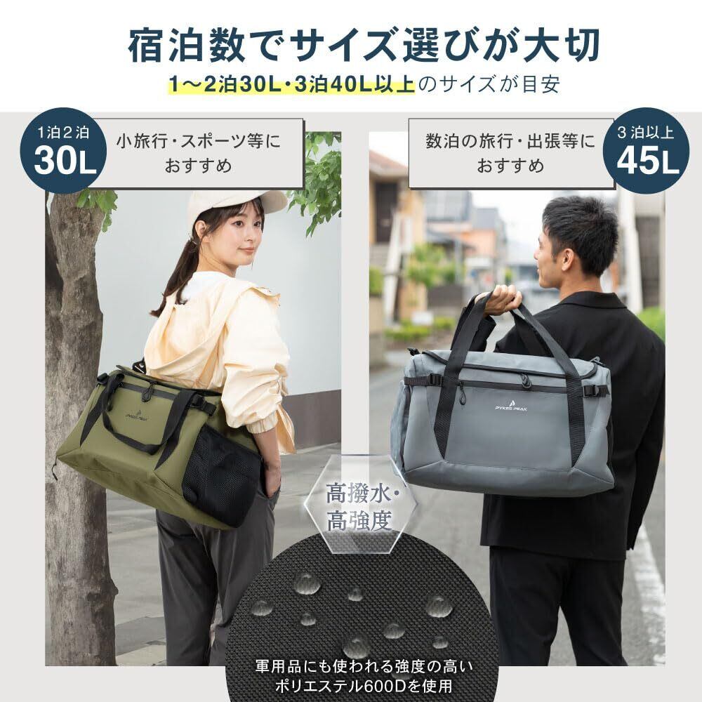【スポーツ・旅行・出張などに最適】PYKES PEAK(パイクスピーク)の新作ボストンバッグ・ダッフルバッグは、スポーツや旅行、出張などさまざまなシーンで活躍する大容量設計が特徴です。一般的な30LのMサイズと、より多くの荷物を収納できる45LのLサイズの2種類から選べます。特に、数日間の旅行や出張、スポーツ時に増えがちな衣類や道具をしっかり収納できるため、荷物が多い方にもおすすめです。
