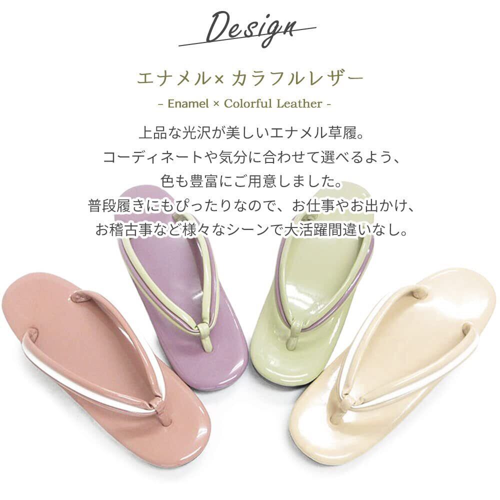 上品な光沢が美しいエナメルウレタン草履でございます。コーディネートや気分に合わせて選べるよう、色も豊富にご用意しました。