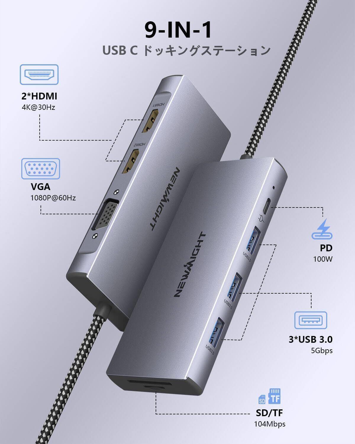 【在庫処分】ドッキングステーション hdmi 2つ Dual Display USB C ハブ Dock 9-in-1 MST デュアル 4K HDMI 拡張 リプル ディスプレイ 2画面 HDMI*2、高速USB 3.0*3、VGA、USB-C PD100W 急速充電、SD&TFカードリーダー MacBook Pro/Airなど対応