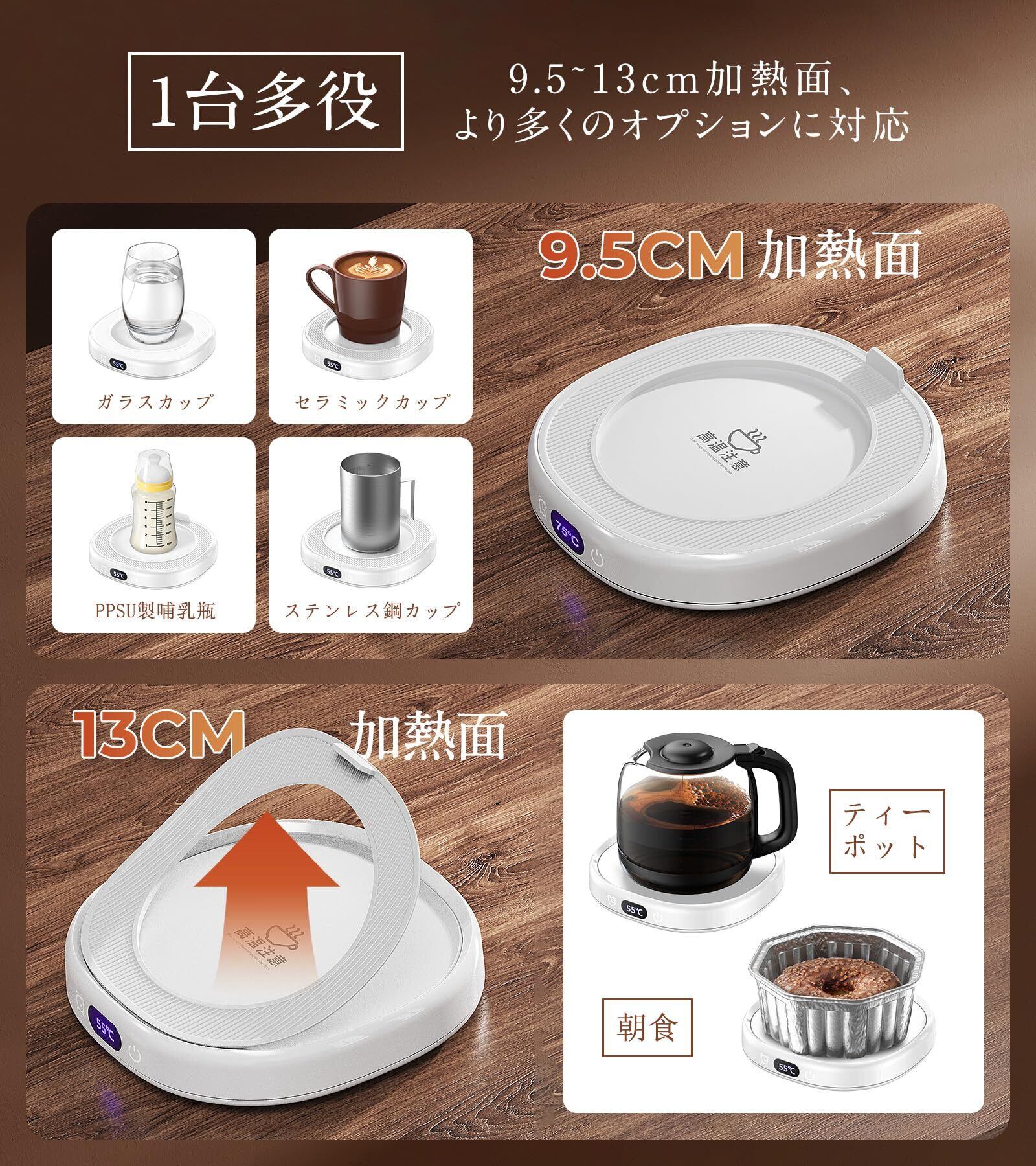 【高コスパ!多様なカップに対応】マグカップウォーマーは、さまざまなユーザーのニーズに応えるために取り外し可能なシリコンマットを搭載、加熱プレートの直径を9.5cmと13cmに瞬時に切り替え可能です。シリコンマットを装着すれば、9.5cmの直径で一般的なステンレス、セラミック、ガラスカップや缶コーヒーに対応します。一方、大きなコーヒーポットやティーポットを保温したい場合は、シリコンマットを外すだけで直径を13cmに拡大できます。これにより、カップのサイズに縛られることなく、料理や味噌汁などの温めも可能になります。多役でコストパフォーマンスに優れたこの一台は、冬に温かい飲み物や料理を楽しむ方にとって、まさにあったかグです!