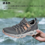 【排水機能】トレッキングシューズの両側は排水溝を搭載しているので、内部へ侵入した水を抜けやすく、不快感を感じなく水遊びや登山にも対応できる水陸両用の靴です。