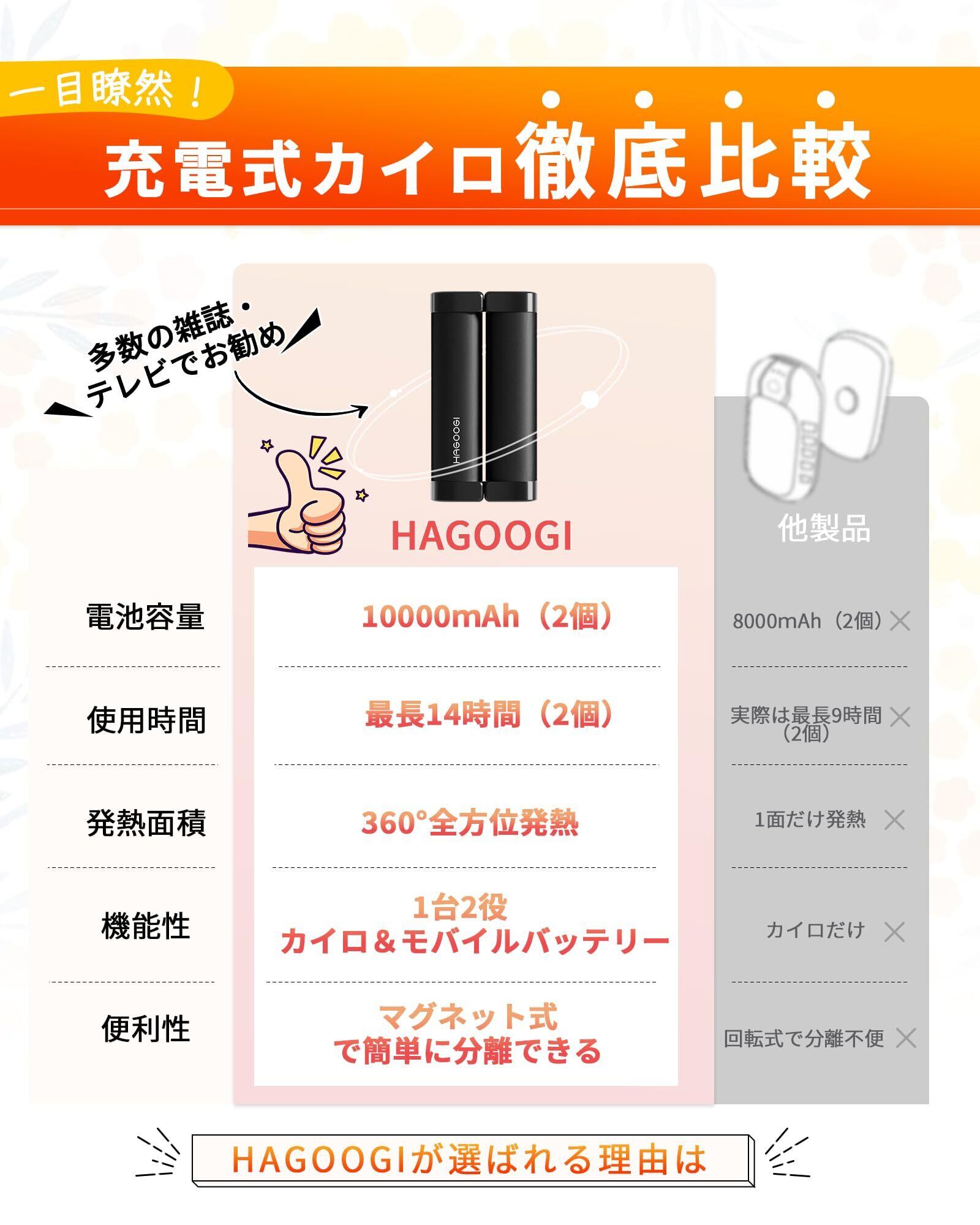 【3秒急速全方位発熱】HAGOOGI充電式カイロは、カーボンクリスタル発熱体を搭載しているので、わずか3秒で発熱を開始します!真ん中が発熱しない従来製品とは異なり、HAGOOGI電気カイロは360°全方位発熱可能の円筒形を採用して、より効率的に、全面的に寒さを凌ぐことができます。