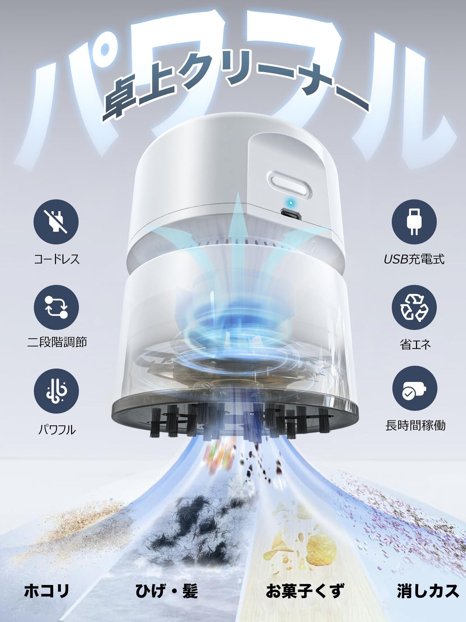 この【IGOKOTI 卓上クリーナー】は、強力な吸引力を誇るデスククリーナーです。最大30000RPMのモーターによる5000Paの吸引力で、消しゴムのカスや細かなごみをしっかりとキャッチします。家庭やオフィスでのちょっとした清掃に最適な一台です!