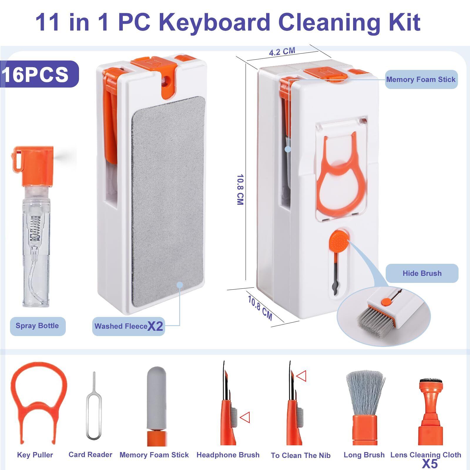 【在庫処分】Bigqin 11 in 1 多機能クリーニングキット イヤホン掃除道具 キーボード、パソコン、ワイヤレスイヤホン、スマホ、カメラ用の掃除ツール スマートフォンホルダー機能付き - オレンジ色