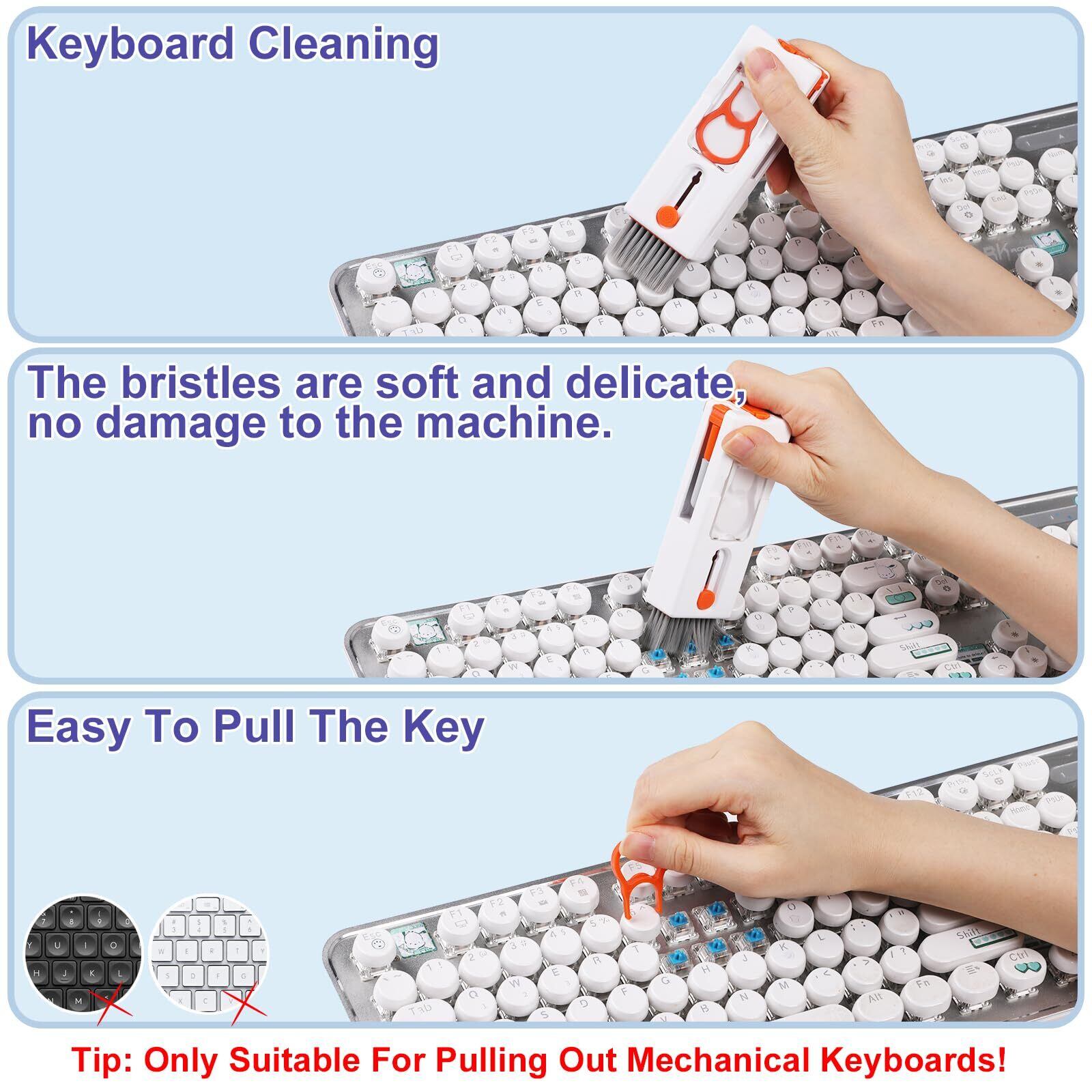 【高密度ソフトブラシ&キーキャップバックル】 高密度ブラシは毛先が密で適度に柔らかいので、各種キーボードやモニターの隙間のホコリ掃除に最適です。 キーキャップ バックルにより、キーを簡単に取り外すことができ、より深いクリーニングが可能です (注: キーキャップ バックルはメカニカル キーボードにのみ適合します)。