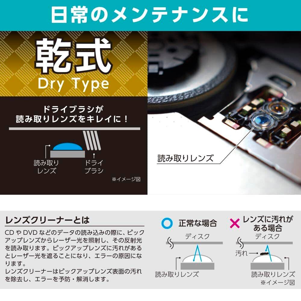 【 仕 様 】 ◆乾式(ドライタイプ) ◆対応機種:CDコンポ、CDデッキ、ポータブルCDプレーヤー、ゲーム機、PC、DVDレコーダー ◆使用可能回数(目安):約100回 ※レンズの汚れ具合により変わります