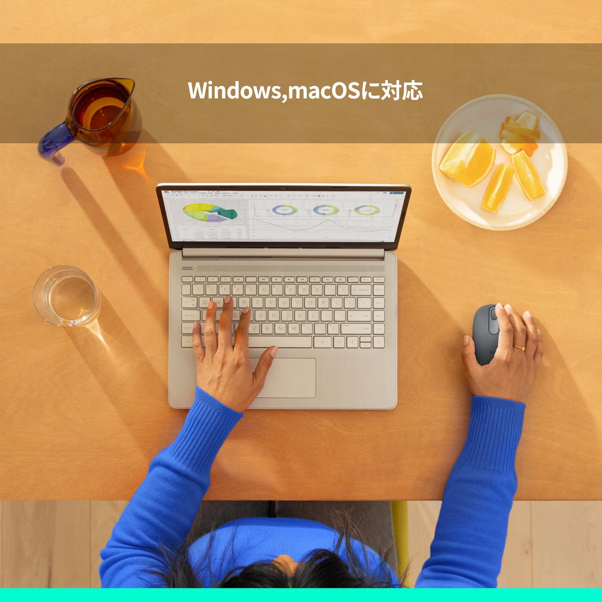 左右対称のデザインで、どちらの手でも快適に使えるマウスです。手に馴染みやすく、長時間の作業でも疲れにくい設計となっています。さまざまなシーンで活躍します。