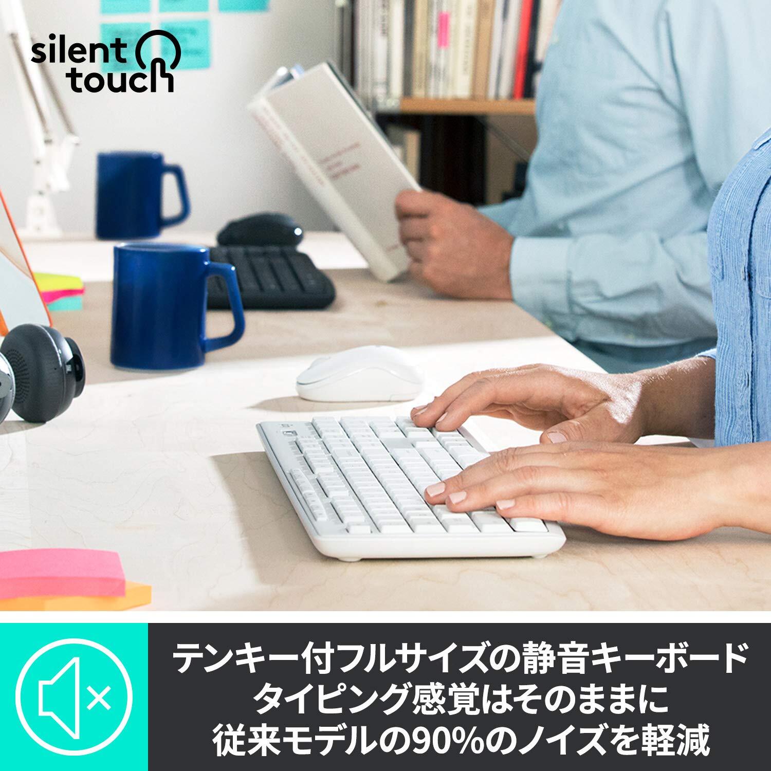 従来モデルより90%の操作音を削減した静音キーボードが登場。ロジクール独自の新技術SilentTouchテクノロジーを採用したこの静音キーボードはタイピング感覚はそのままに、静かな場所でも人を気にせず作業することができます。 キーボードは8つのショートカットキーとテンキーを搭載したフルサイズの日本語配列キーボード。水をこぼしても安心な耐水設計で、キースイッチは耐久性に優れています。 裏面には8度の傾斜をつけられるスタンド付き。タイピングがしやすくなっています。 接続はUnifyingUSBレシーバーに対応。アドバンス2.4GHzワイヤレス接続で最大10mの接続範囲に対応し、混雑したワイヤレス環境でも途切れにくくなっています。 最長24ケ月の長電池寿命も魅力のキーボードです。 対応OS:Windows7以降、Chrome OS