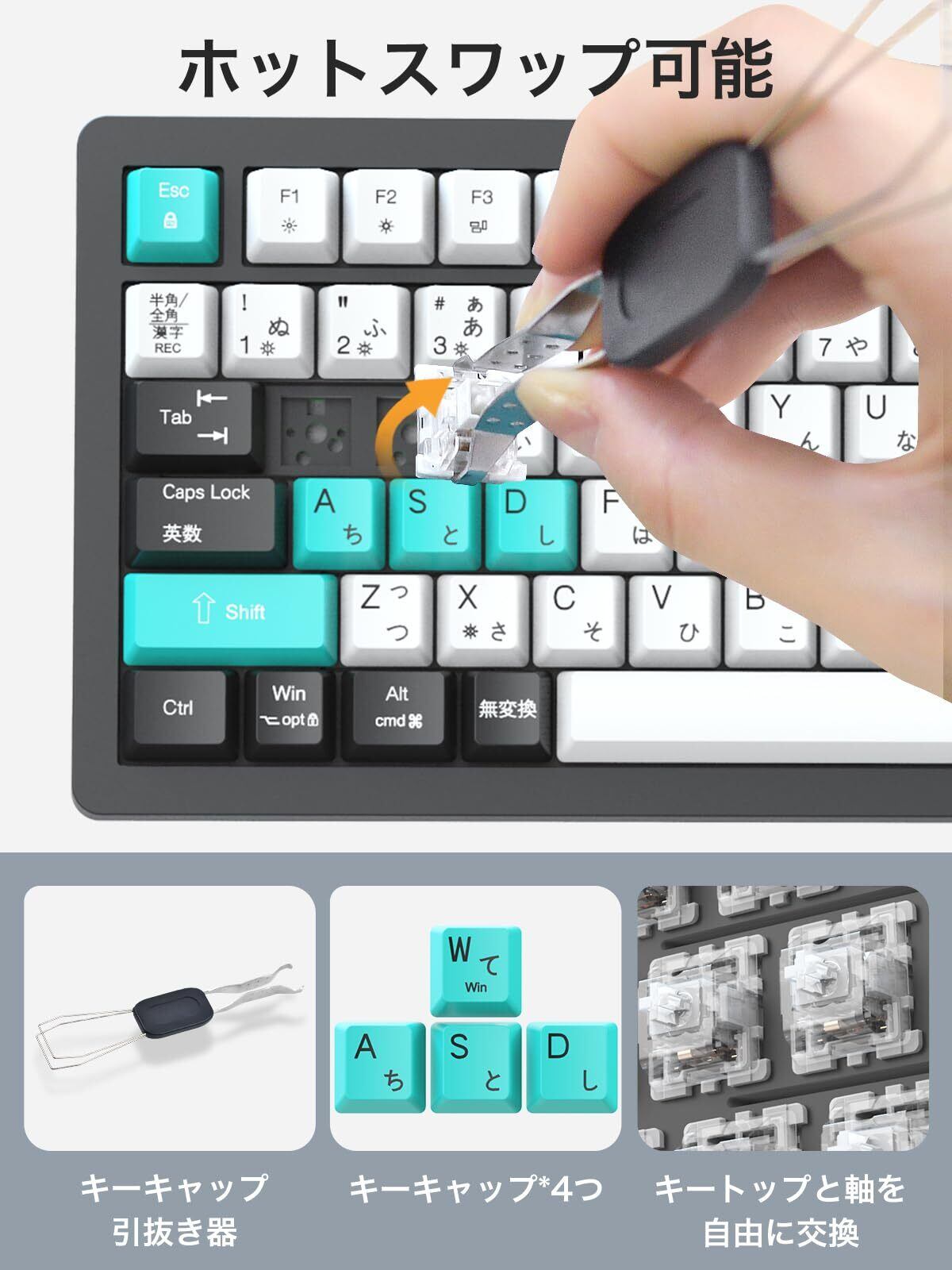 【ホットスワップ対応Mac/Win互換性】ホットスワップ設計を採用しており、工具なしで簡単にスイッチの交換が可能です。これにより、市販の99%のメカニカルスイッチに対応し、好みに合わせて自由にDIYできます。自分だけのカスタマイズされた打鍵感を楽しむことができます。MacおよびWindowsオペレーティングシステムと完全に互換性があります。