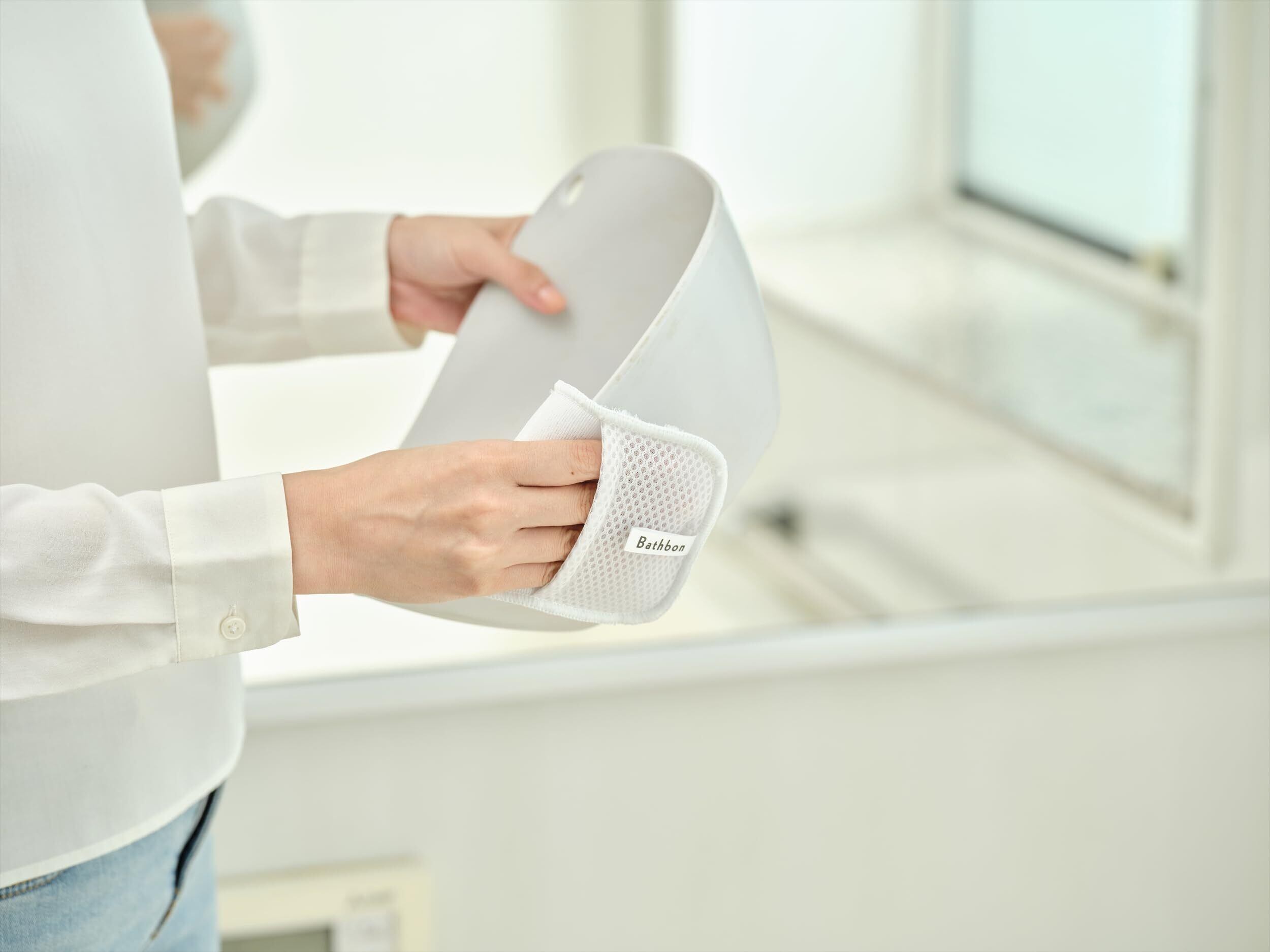 折り目が付いているため、しっかり手にフィットします。軽くお風呂のフチや洗面器などを、しっかり挟み込んで効率的にお掃除することができます。シャワーヘッドの汚れ取りにもおすすめです。