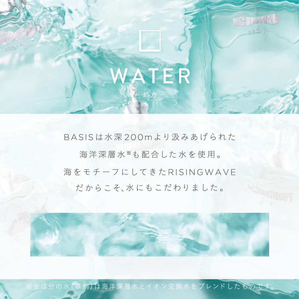 ■【Product】 海がモチーフのライジングウェーブだからこそ水にもこだわった処方で、 水深200mより汲みあげられた海洋深層水を配合した水を使用。 *1一般的な水に比べ化学物質による汚染や雑菌が少ないことが特徴です。 全成分の水は海洋深層水とイオン交換水をブレンドしたものです。