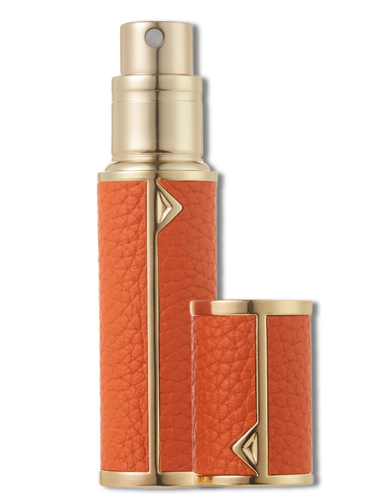 AlxMuNao アトマイザー 香水【5ml・ワンタッチ補充・携帯用】プレミアムレザー仕様 底部充填 詰め替え簡単 漏れない 持ち運び便利 コンパクト 小分けボトル 旅行 デート 仕事 男女兼用 (オレンジ)