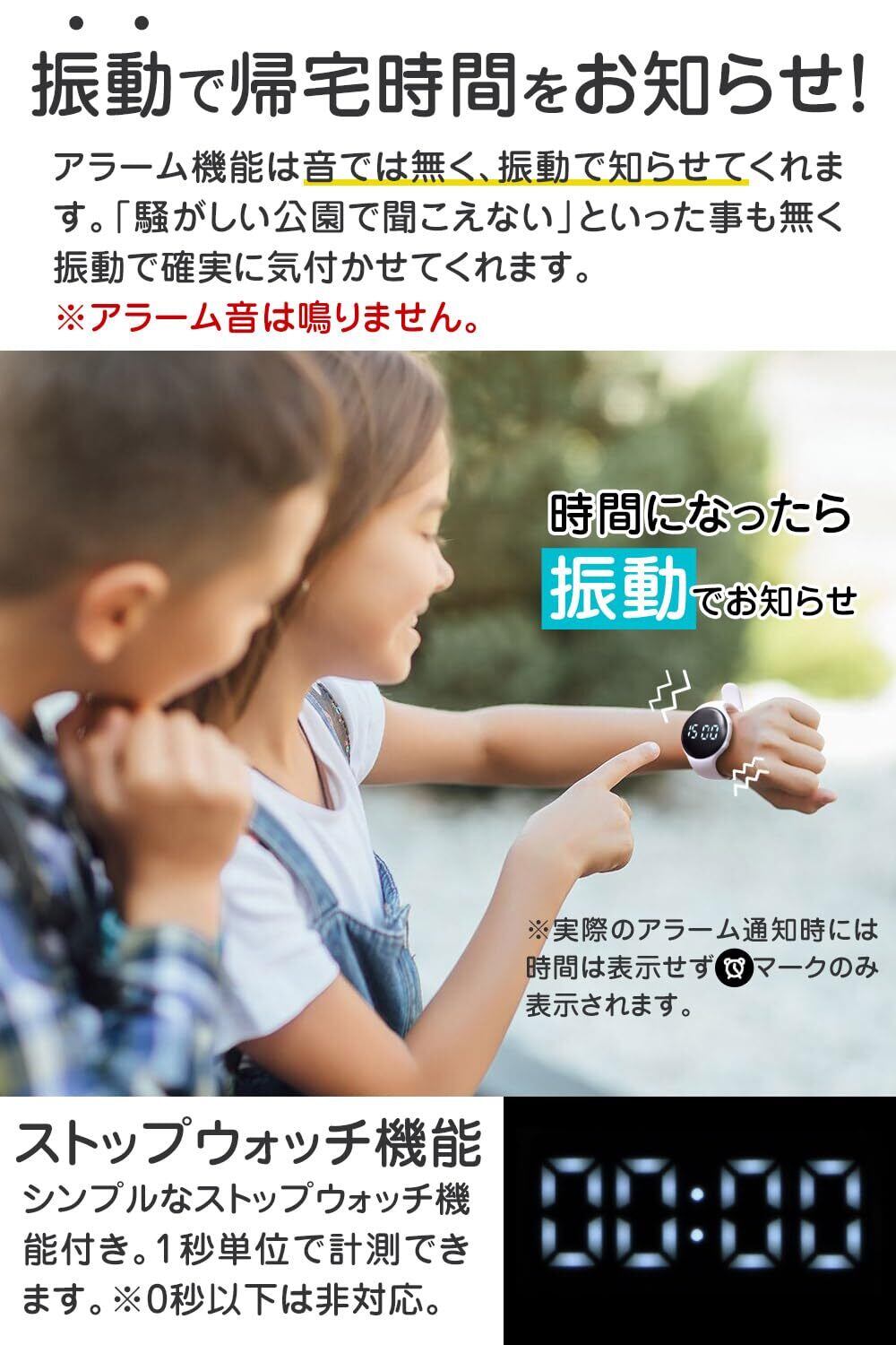 【 帰る時間だ!帰宅を知らせる振動アラーム 】 振動モードを採用した音が鳴らないアラームで、図書館などの静かな場所や人が多い場所など、どんな場所でもアラームを活用できます。用途は目覚ましや、お子様が門限通りに帰宅できるよう促すアラームとして活躍します。多機能でお子様の日常生活をサポートします