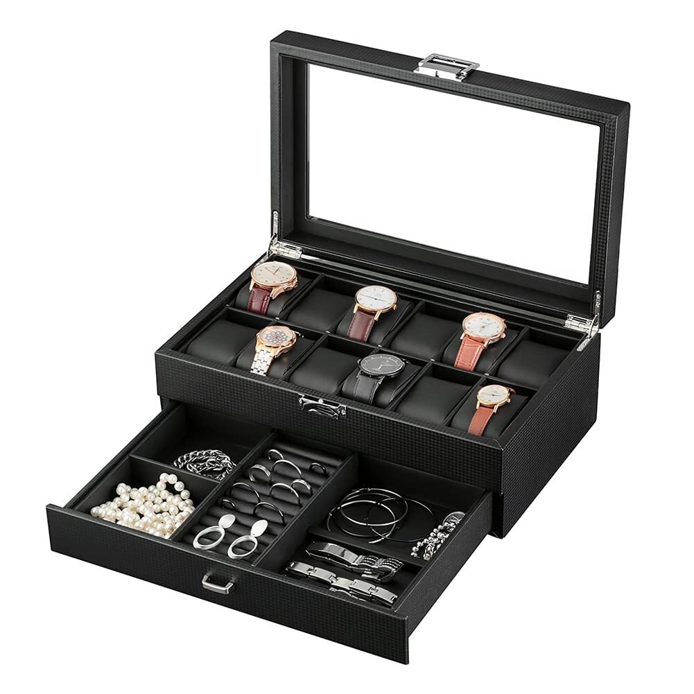 【特価商品】腕時計収納ケース アクセサリー 収納 時計ケース 12本 時計 収納ボックス 2段式 高級 ウォッチ 収納ケース コレクションケース PUレザー製… (12本 2段式-炭素繊維)