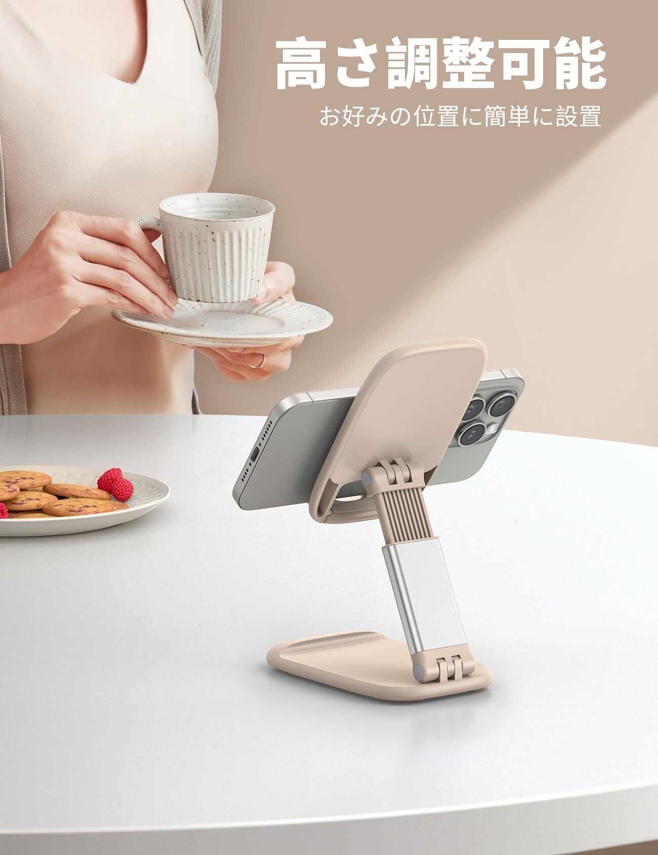 Lamicall 折り畳み 高さ調整 スマホスタンド 伸縮 : 角度 折りたたみ 携帯 アイホン すまほ スマホ 立て 置き 台 卓上 机 つくえ デスク 縦 横 滑り止め コンパクト アイフォン スマフォ アンドロイド iPhone 17 Air 16e 16 15 14 plus pro promax 13 mini 12 se Huawei Xperia android に対応 ベージュ