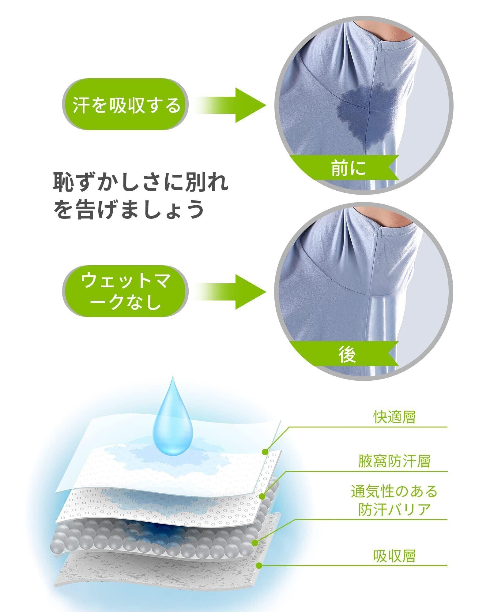 優れた吸収力を持つこの脇汗パッドは、じっくり汗を吸い取り、湿気を抑えます。これにより、べたつかず、常にさらりとした状態をキープ。加えて、防臭機能が備わっているため、気になるニオイも抑え、清潔感ある印象を与えます。