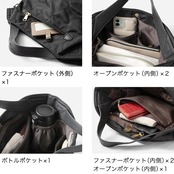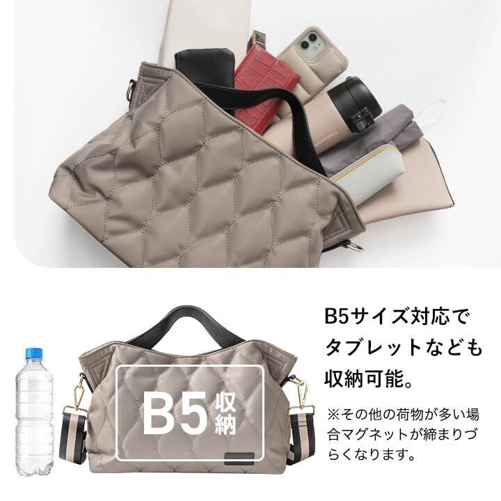 くったりフォルムの上品な大人トート。 ふっくらとしたナイロンキルティングがお洒落。 毎日の通勤や通学でも疲れにくい、2way軽量バッグ! 手や肩への負担も少なく、デイリーユーズにぴったり。 B5ノートが収納できる丁度いい大きさと収納力◎ 7つのポケットも付いているので小物収納にも困りません。 開閉はワンタッチで簡単に開けられるマグネットボタン。 バッグの中で倒れがちな水筒や500mlペットボトルを 立てて収納できるボトルポケットも付いています。