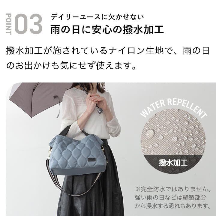ハンドルはPUレザーを使用し高見えするデザインに。 ショルダーベルトは取り外しと長さ調節も可能です。 ふっくらキルティングがおしゃれな高密度ナイロン生地を使用。 撥水加工が施されているので雨の日のお出かけでも安心! 年代問わずにご愛用いただけるバッグですので ご家族とも共有してお使いいただけます。