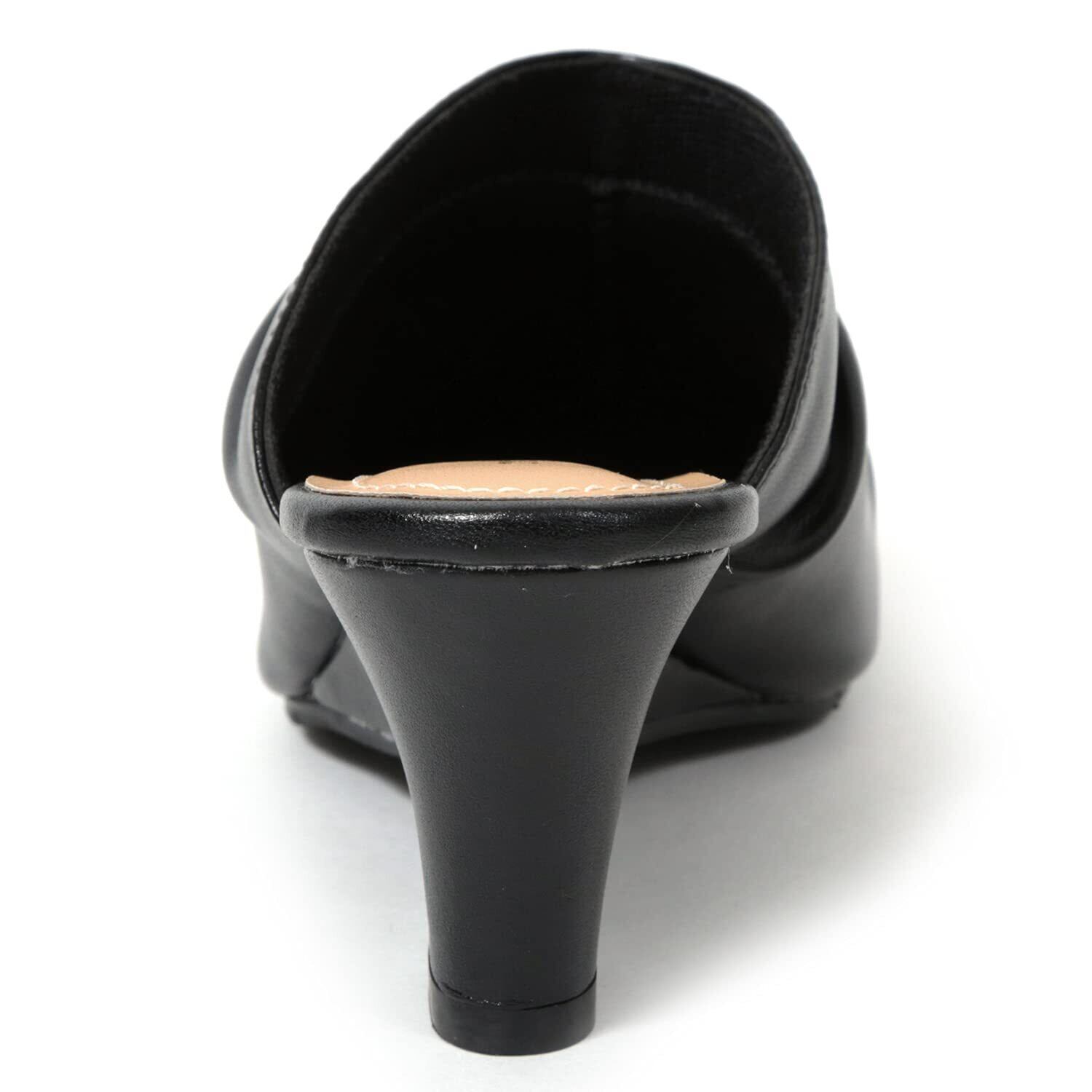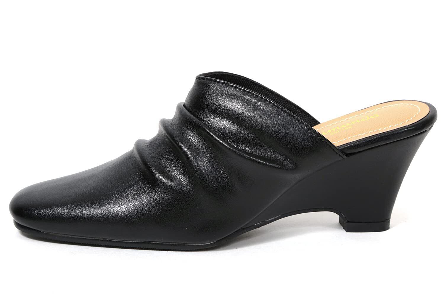 レディース ミュール サンダル。シャーリングを施したフェイクレザーのアッパーとコロンとしたトゥがおしゃれ。オフィススタイルにも合わせやすいウェッジソールミュールです。