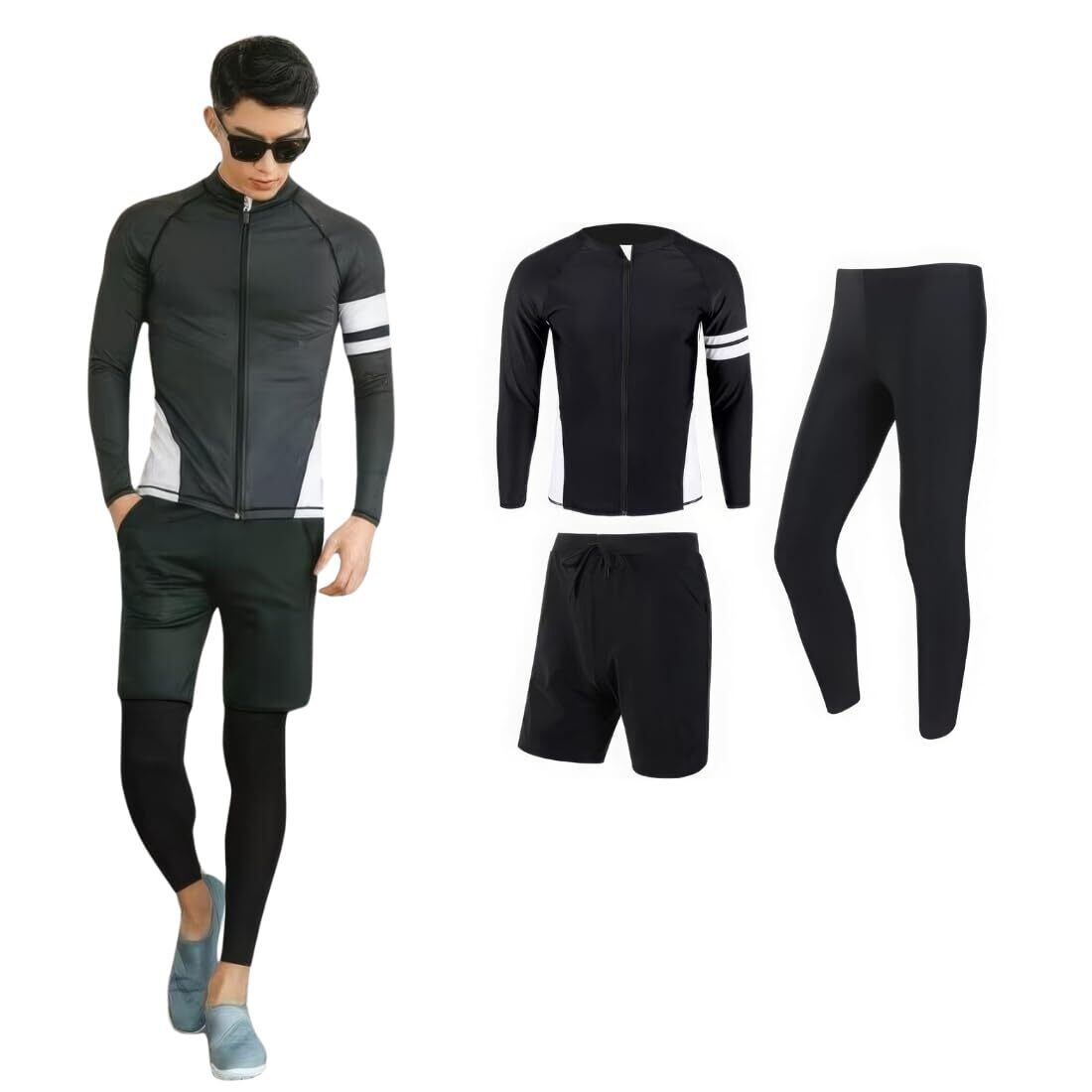 【新着商品】[wechose] ラッシュガード 水着 メンズ 上下セット フィットネス水着 3点セット ジップアップ 長袖 前開き スイミング サーフパンツ レギンス ビーチ 水泳パンツ UVカット UPF50+ 温泉 競泳 通気性 水陸両用 吸汗速乾
