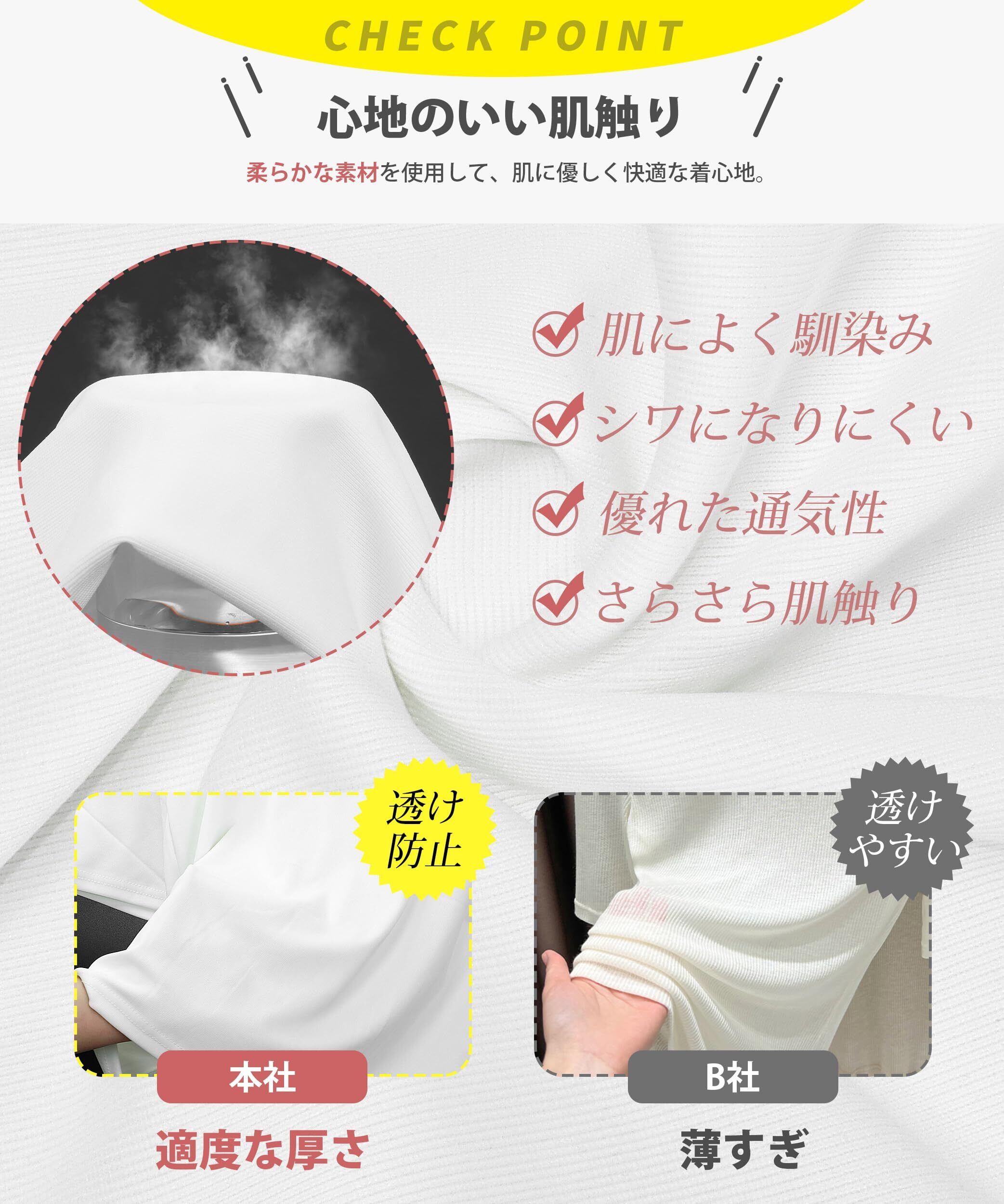 このTシャツは通気性の良い素材を使用しており、暑い日でも快適に過ごせます。肌に優しい仕上がりで、さらりとした感触が心地よく、長時間の着用でも快適です。また、透けにくい設計になっているため、安心してさまざまなシーンでご利用いただけます。