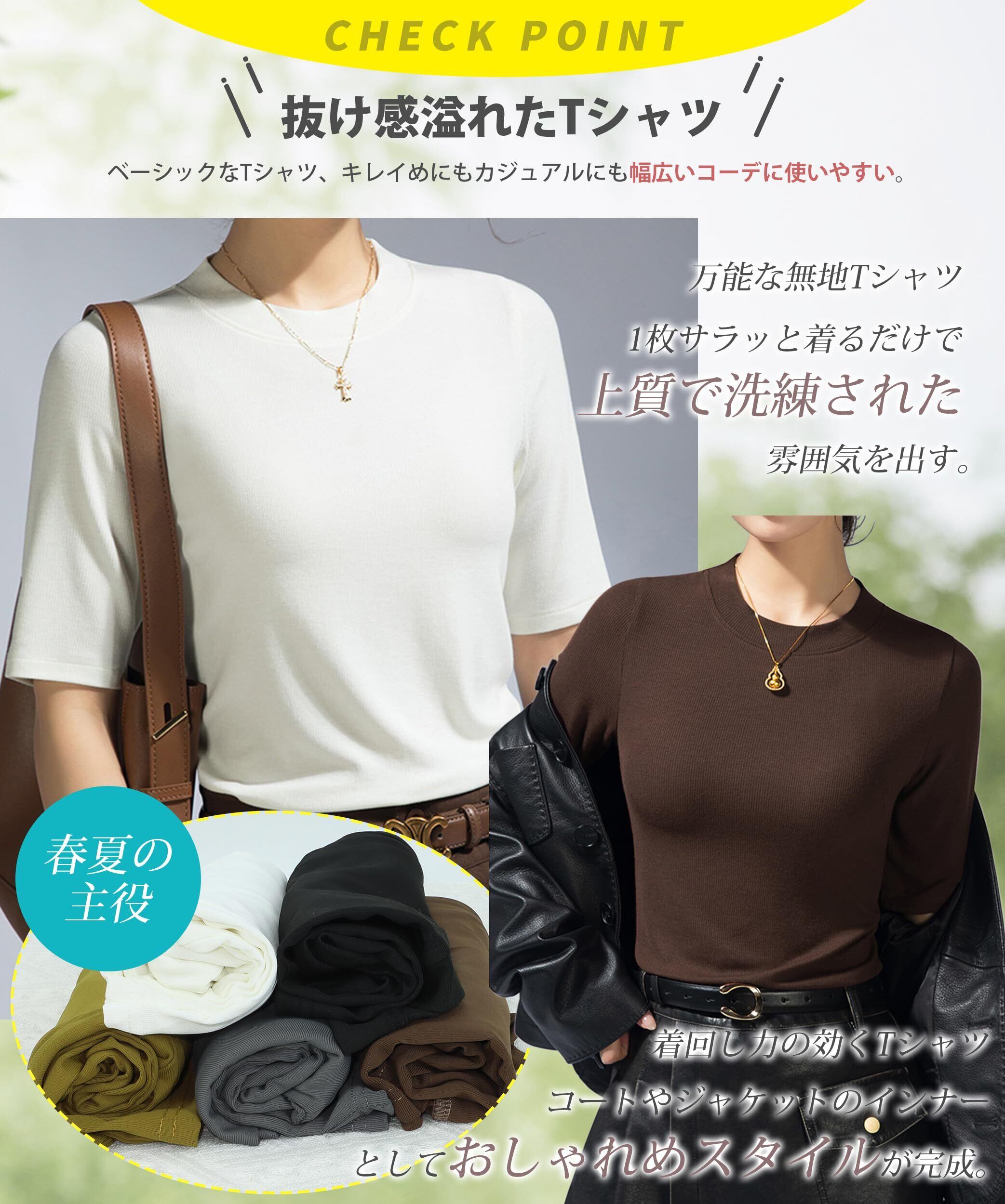 【春夏の主役】ベーシックなクルーネックTシャツ、1枚でさらっと着ても、重ね着にも使いやすい。体のラインを上手に隠すTシャツ、女性らしさを感じさせてくれます。1枚で即こなれる優雅な印象を与える5分袖Tシャツ。コートやジャケットのインナーとして合わせるも重宝しています。トレンドに左右されないシンプルなTシャツ、上品で大人っぽさを演出できます。