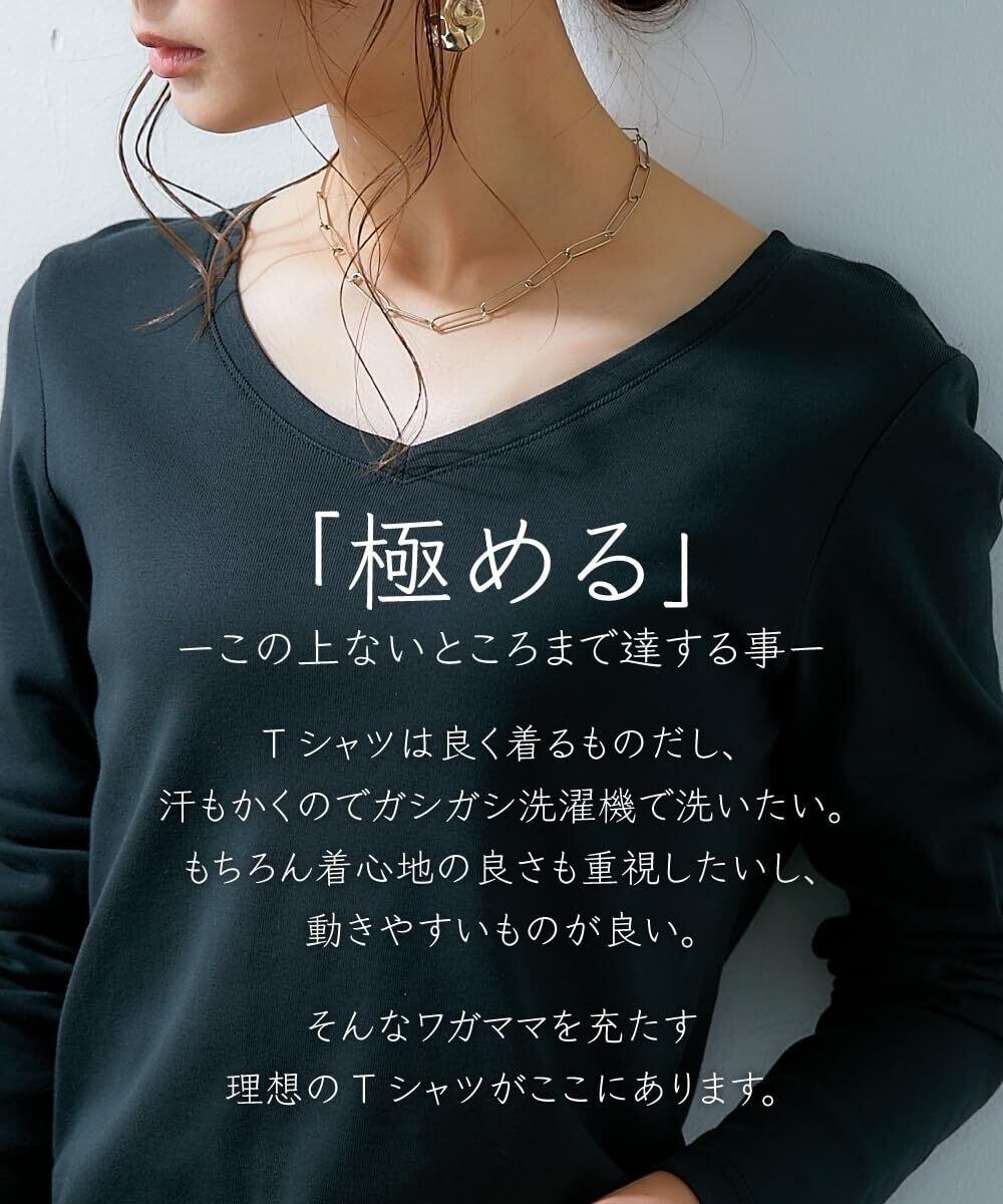 このTシャツは、洗練されたVネックが特徴的で、すっきりとした印象を与えます。程よいフィット感で、ボディラインを美しく見せてくれます。長袖タイプなので、肌寒い日や日差しが強い日にもぴったり。どんなシーンにも対応できる万能アイテムです。