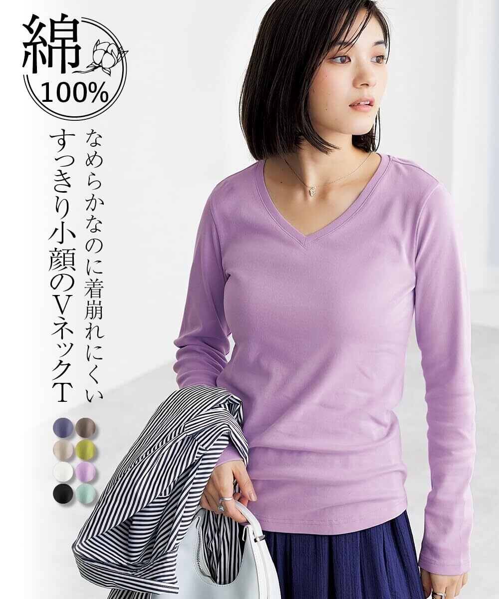 「[ニッセン] UVカット綿100%フライス素材Vネック長袖Tシャツ」は、現在特別価格でご提供中!この機会に、快適でスタイリッシュな一枚をぜひ手に入れてください!