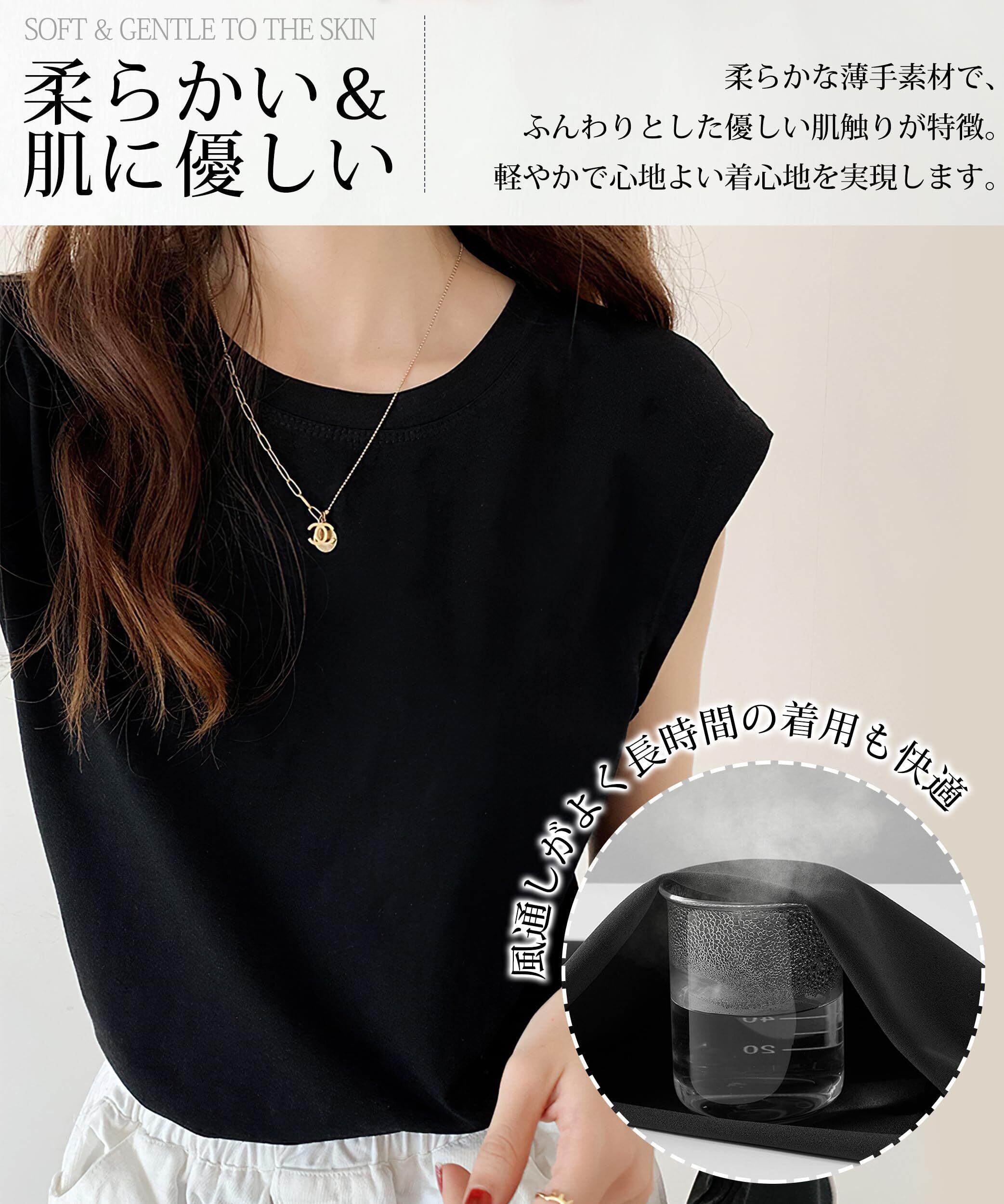 【ノースリーブ・ひんやりと気分よい】両腕が呼吸しやすく、涼しく快適に保つノースリーブTシャツです。ゆったりしたフィットで、風通しがよく蒸れず、動きもやすい。夏の日差しの下でも、エアコンの効いた室内でも、肌に負担なく爽やかな使い心地をもたらしたフレンチスリーブ トップス。