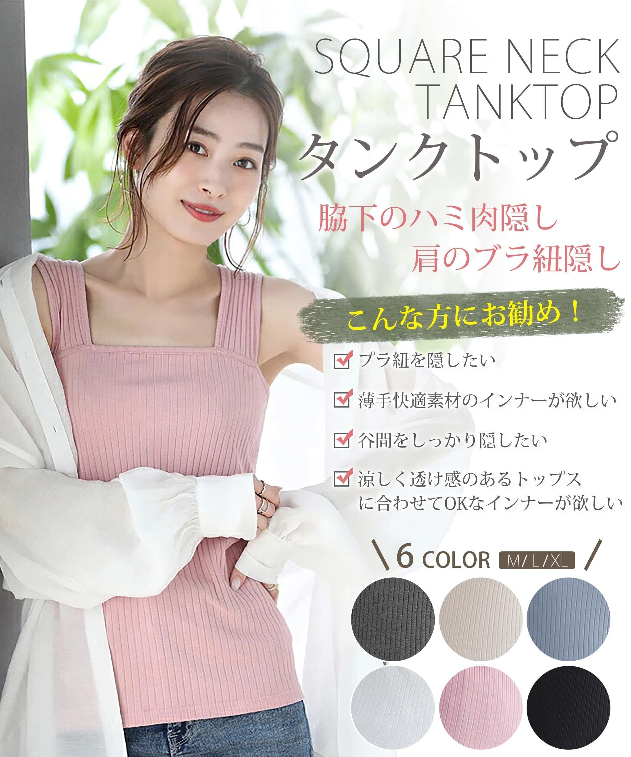 【改良チラ見え防止デザイン・美背中効果】この改良チラ見え防止デザインのタンクトップは、胸元のスクエアネック+背中のゴムでフィット感を高め、前かがみになっても隙間ができず、チラ見え防止できる仕様です。タンクトップはスクエアのネックラインデザインは、鎖骨のラインを強調し、胸や背中の脂肪を適度に抑えて、上半身の引き締め効果があります。また、タンクトップは脇の部分が程よい広さで、肩まわりが動きやすく、背中のスクエアデザインが肩幅を長めに、二の腕が細く見せてくれるのは嬉しい!シルエットが綺麗で体のラインが綺麗に見えます!タンクトップは動きやすく、お洒落と機能性の両方を持ち合わせた、重宝でる便利なタンクトップです。