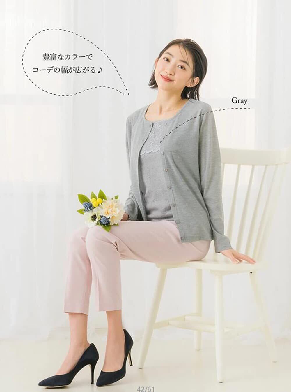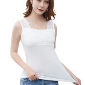 このタンクトップは、インナーとしても安心して着用できるチラ見え防止仕様。気になる脇下や胸元をしっかりカバーし、安心の着用感を提供します。レースの柔らかい風合いが、肌に優しくフィットし、ストレスフリーな着心地を実感できます。