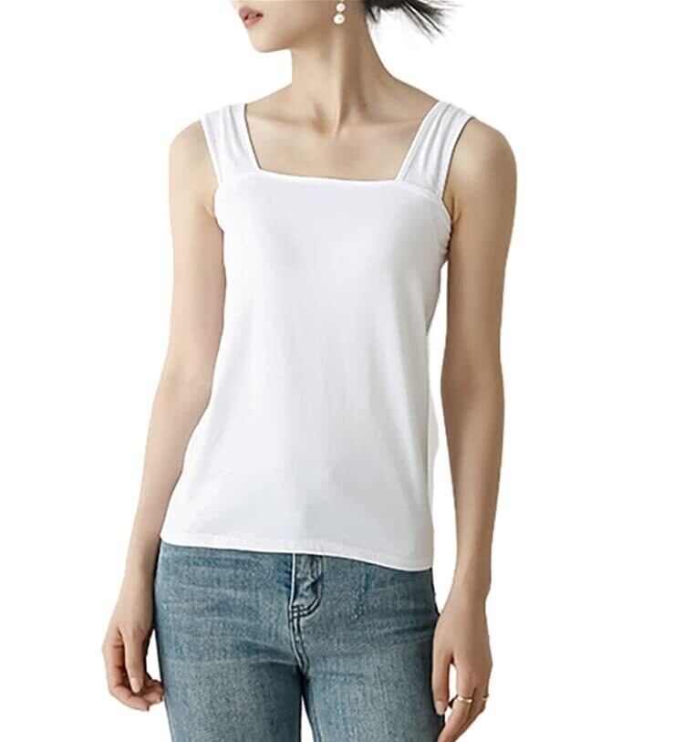 【ブラ紐&脇も最強ガード】 幅約6cmの太めストラップがブラ紐をしっかりカバーし、シースルー素材のトップスとも相性抜群。ブラ紐を気にせずおしゃれに着こなせるタンクトップです。さらに、脇高設計でアームホールの広いチュニックなどのアウターとも好相性。横からのチラ見えを防ぎつつ、しっかりフィットして安心の着用感を実現します。