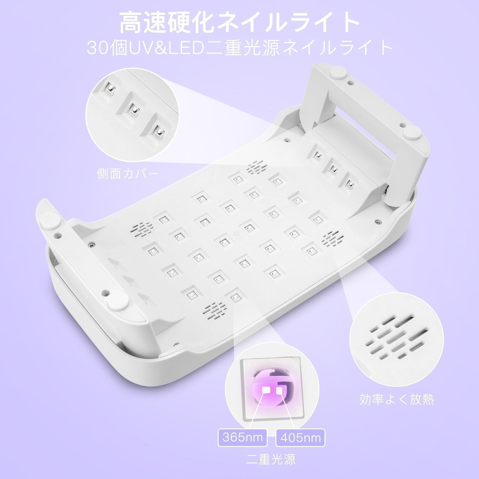 高速硬化と四階段タイマー:このUV&ledネイルランプは最新的な二重光源技術を採用して、紫外線のサンライトを模擬して各種ジェルネイルを硬化することができます。30個の二重光源(UV+LED、365nm+405nm)がライトの上部と側面に均等に配置されており、全方位にすばやくネイルを硬化することができます。四階段タイマー(30秒/60秒/90秒/120秒)があり、アクリルネイルの異なるな硬化時間に応じて選択できます。