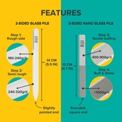 このガラス爪やすりは、細かい粒子で作られた高品質なもので、爪の表面を優しく整えます。驚くほど滑らかな仕上がりを実現し、爪を傷めることなく、健康的な美しさを保つことができます。ナノガラスバッファーもセットになっており、爪の艶出しや最低限の整形がスムーズに行えます。