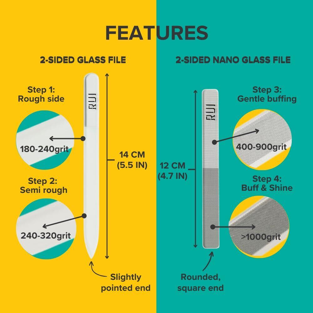 ガラスの爪やすりは、なめらかで光沢のある爪に必要なものすべて。再利用可能で持続可能。エメリーボードよりも優しく、もろい爪にも適しています。このセットには4種類の爪やすりが入っており、保護ケース2個とプラスチック製スリーブが付属しています。